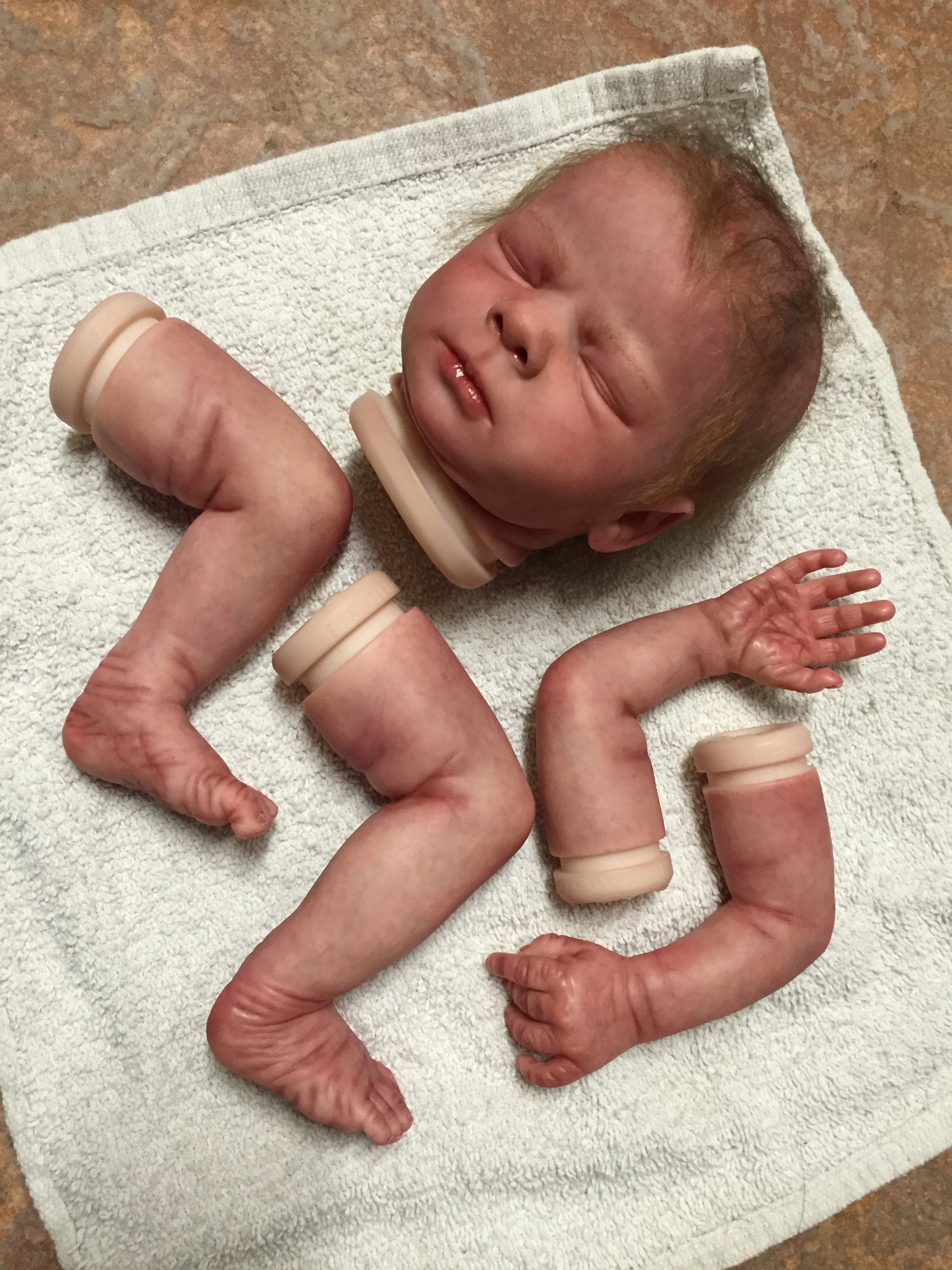 Ahhh! She wants a brand new baby. I would try on a test limb first but I’m thinking the thin layers of a red/pink as andik suggested. I would also think a thin wash of blue or purple as that would add dimension or translucency to the skin and some mottling maybe slightly lighter or darker than your red/pink washes. A faint mottling of vein blue (as one of your first layers) will give the appearance of blood flow under the skin. Also if you look closely, you will notice new babies nail tips are more yellowish than our premixed nail tip colors.