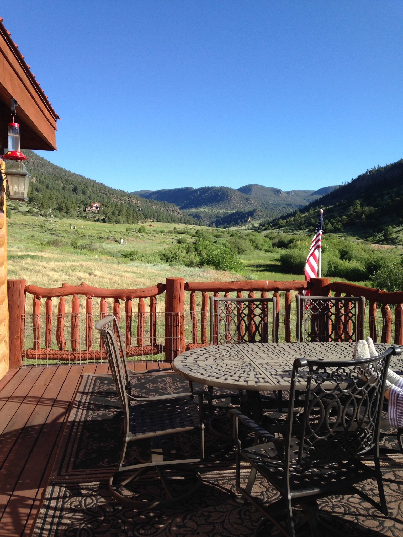 I have been in New Mexico and South Fork Colorado since last Tuesday and I would love to not go back to the heat in Oklahoma. Headed home tomorrow, but this is the view from the deck at our friend!s house.