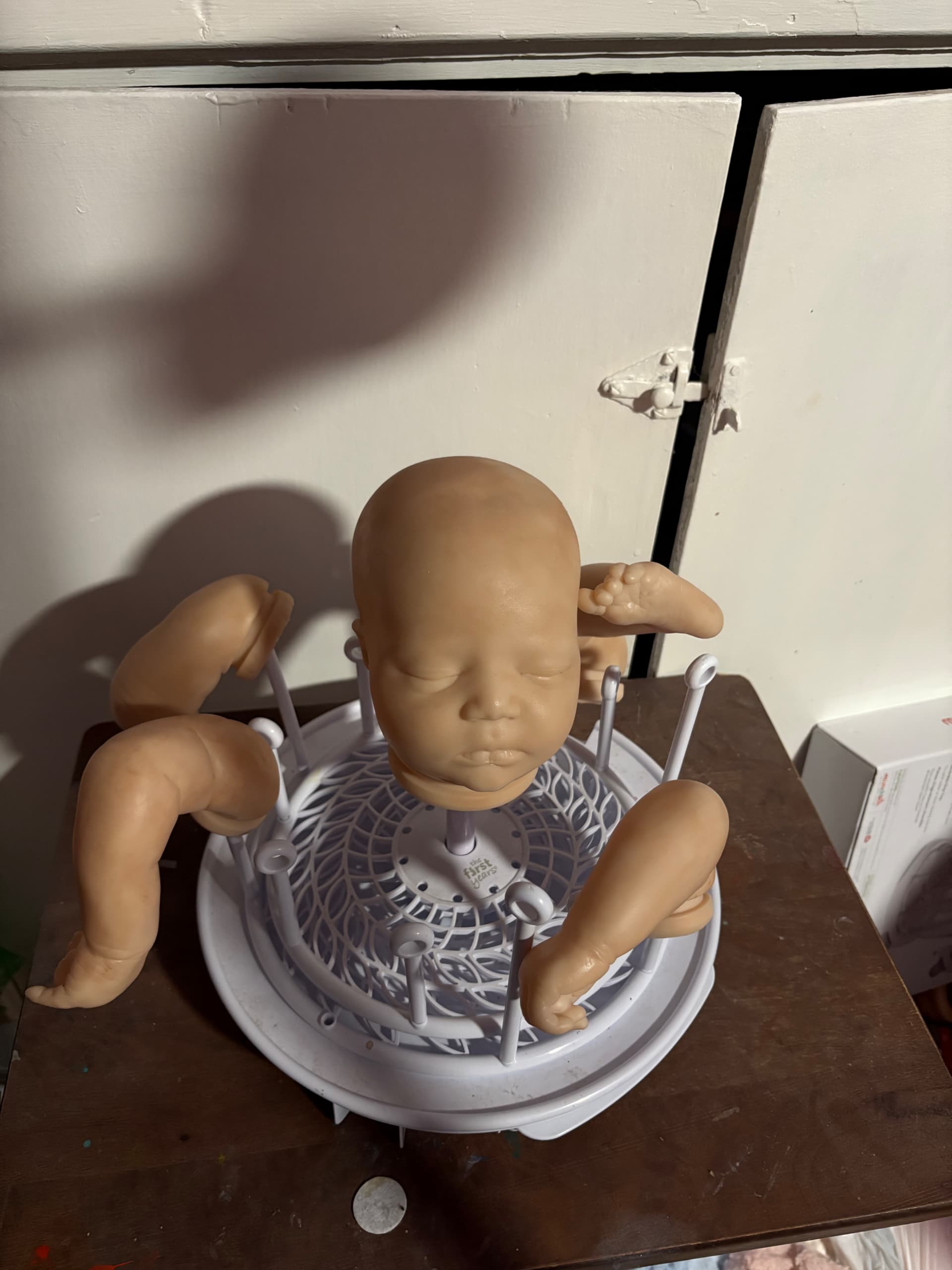 Hi there everyone! I am currently working on a Realborn Johannah asleep. I use air dry paints Golden, Waterborne, UF & Rebornfx. It seems no matter what method I use to apply the paint, wether I paint it on and gently pounce with a sponge or kabuki brush or I smooth on the paint with a cosmetic wedge, it still keeps being patchy. The color is burnt umber. I’m not sure if it’s any of the mediums I’m using. Jo Sonja’s flow medium, slow dri, water etc. I’ve already stripped her once with rubbing alcohol and washed it off with soap and water. Feeling frustrated.