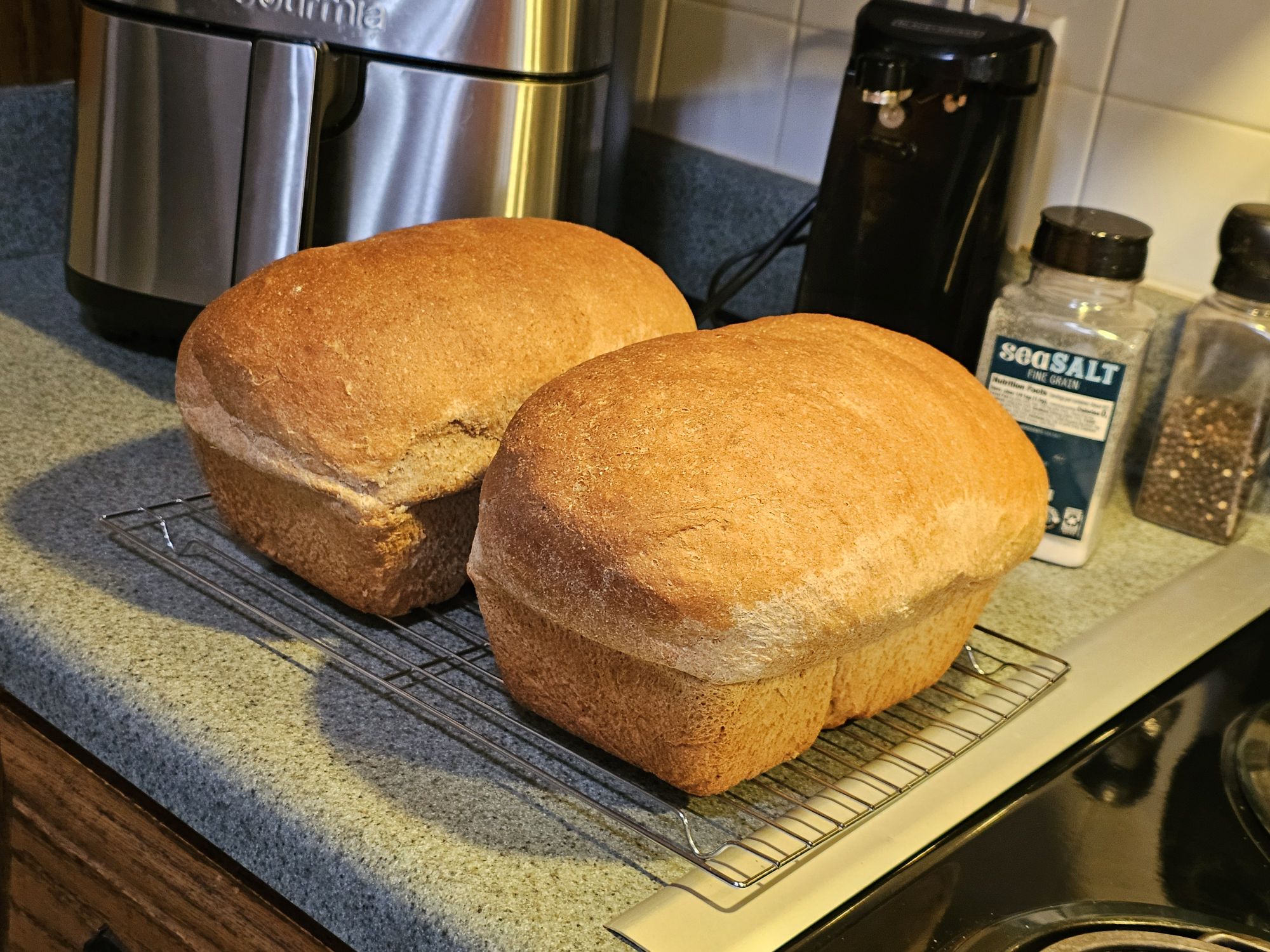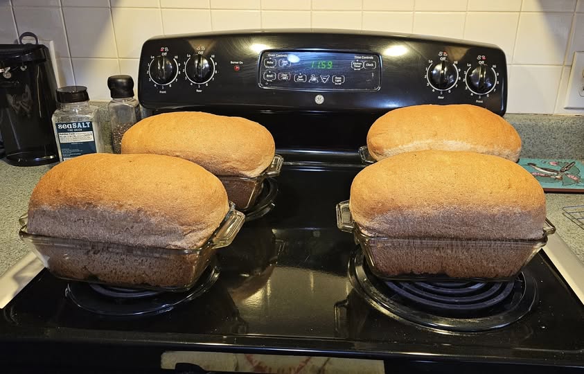 Today I baked bread. I love milling my own wheat and making my own bread. I bought a Zojirushi bread oven that I have been using to make 1 loaf in for just me and hubby. However, today I got out my Bosch machine and made a large batch. I forgot that the amount of dough I made would make 5 large loaves and instead I put it in 4 pans so I have huge loaves of bread! I usually freeze the extra to have for later so in this case I cut each loaf in half and froze them in halves.