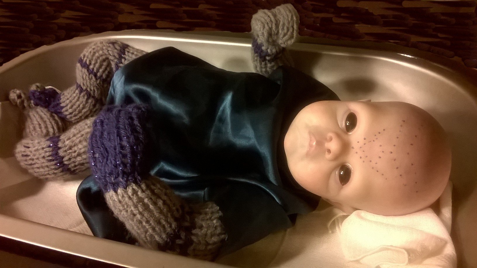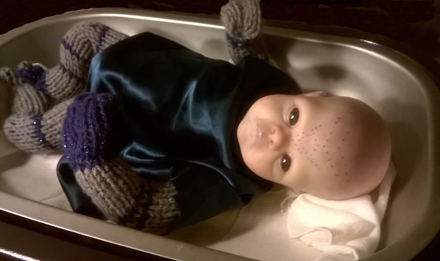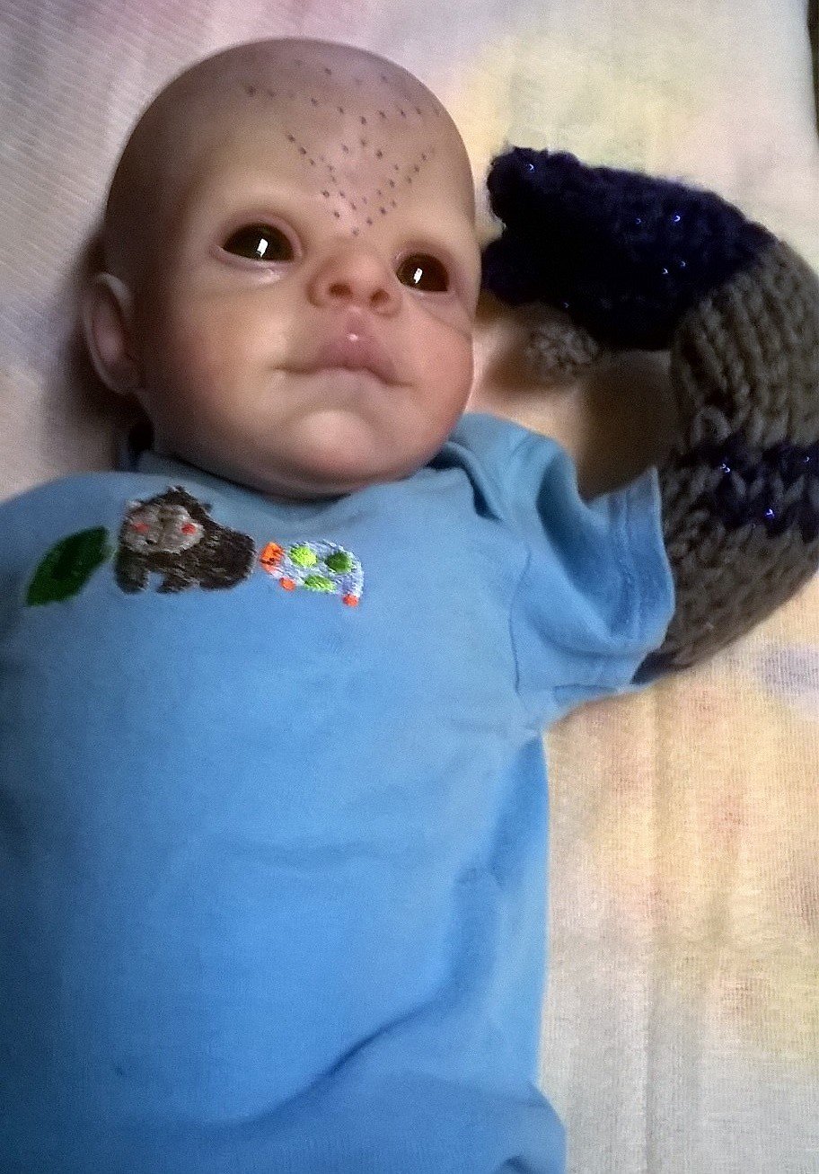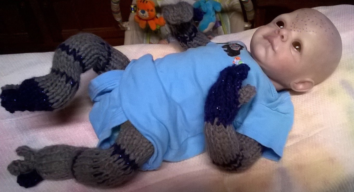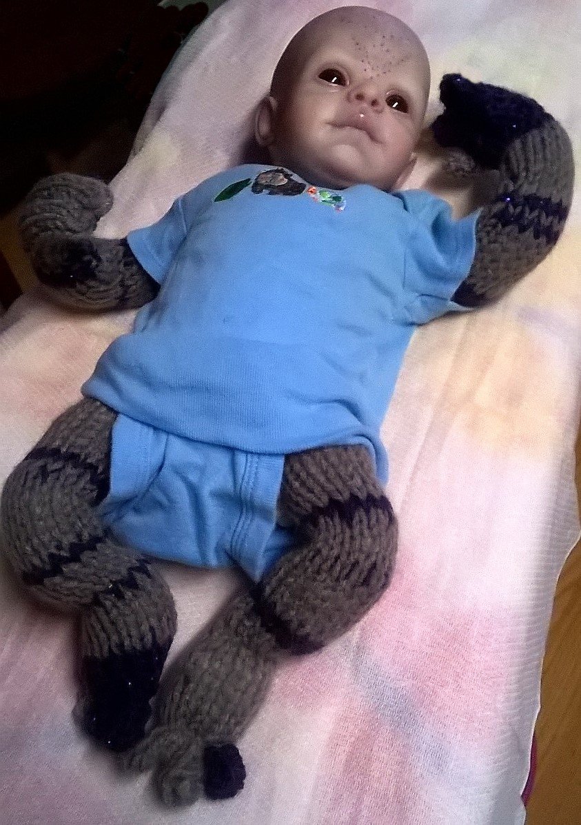 My most recent knitting loom and reborning endeavor this is Loomer who has come from far away and had such a bad entry in to our atmosphere his limbs were so badly damaged he required immediate limb replacement .