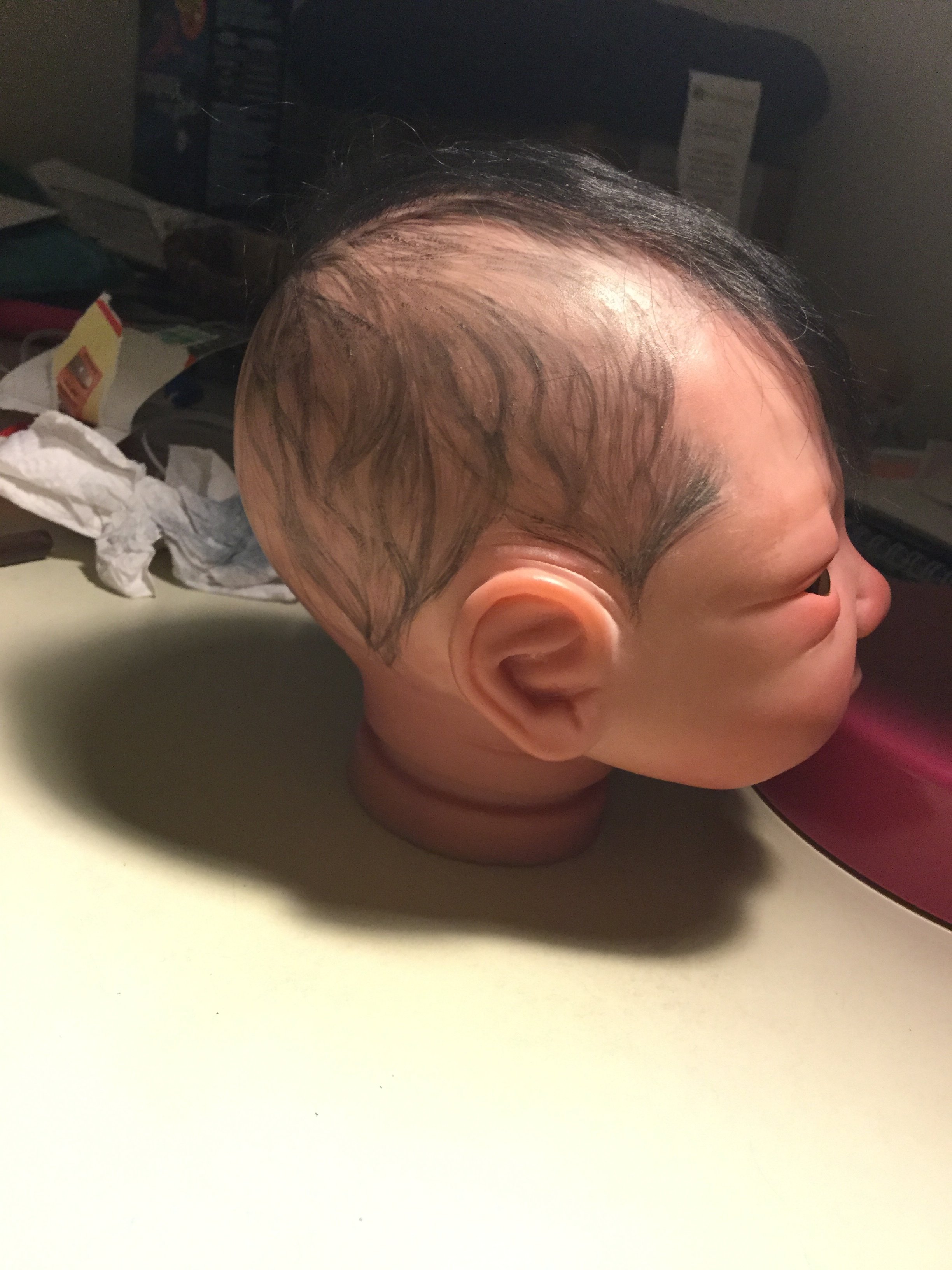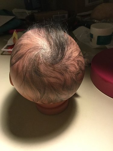 I decided there was no chance of me finishing rooting before I turn 80 at the pace I was going. So, I pulled out a tiny bit and turned Addison into a combi baby…here is a WIP. I just started today and this is my FIRST attempt at penciled hair.