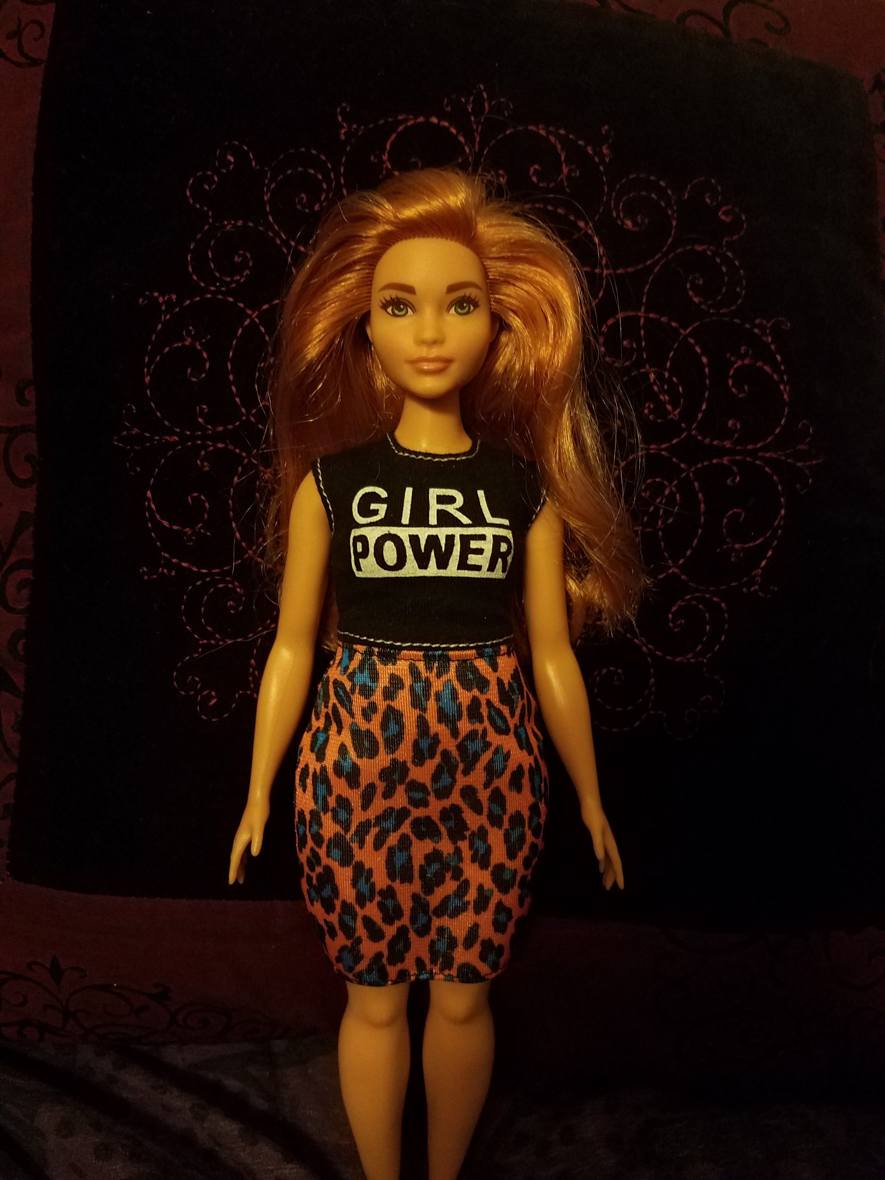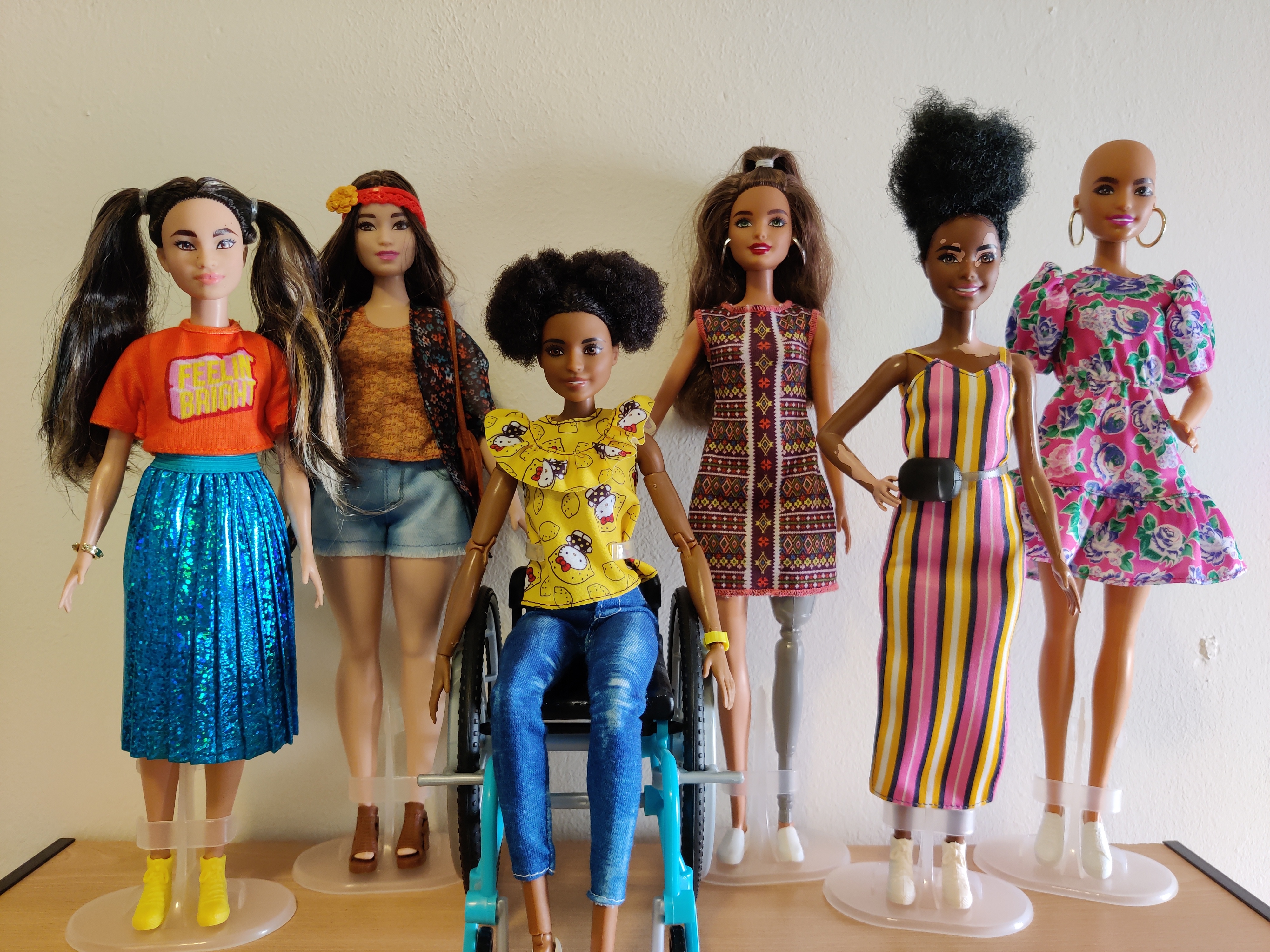 My Barbie Fashionista dolls. Kinda hard to tell, but they are all special in a way. From left to right: one with birthmarks or moles in her face, a curvy one, one in a wheelchair, one with a prosthetic leg that can actually come off, one with vitiligo and lastly a bald one.