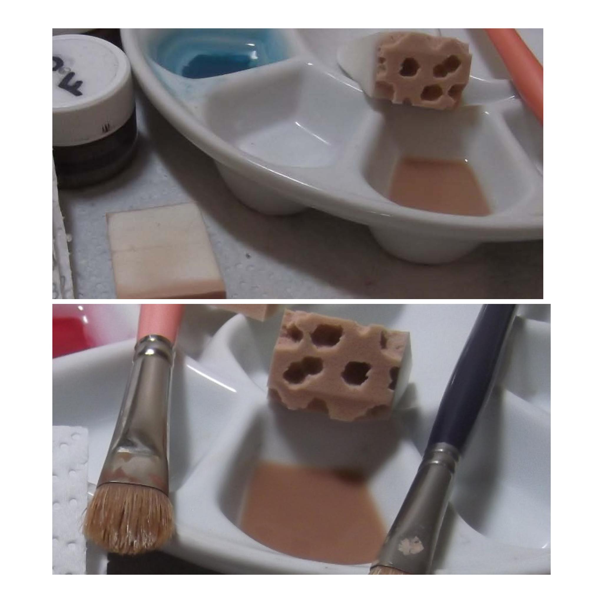 Hi there everyone! I have a question. I was looking at an old tutorial I have and when I got to the skin tone part, it said to mix 2 brushes of flesh 05, 1 brush flesh of flesh 07 and 1/2 brush of flesh 03. In the tutorial, the artist uses heat set paints while I use air dry. Air dry does have the flesh paints but I feel when I mix the colors up, I don’t get the same color as the tutorial. I feel like mine comes out darker. Here’s a picture of what I am talking about: (Both pictures are from the tutorial)