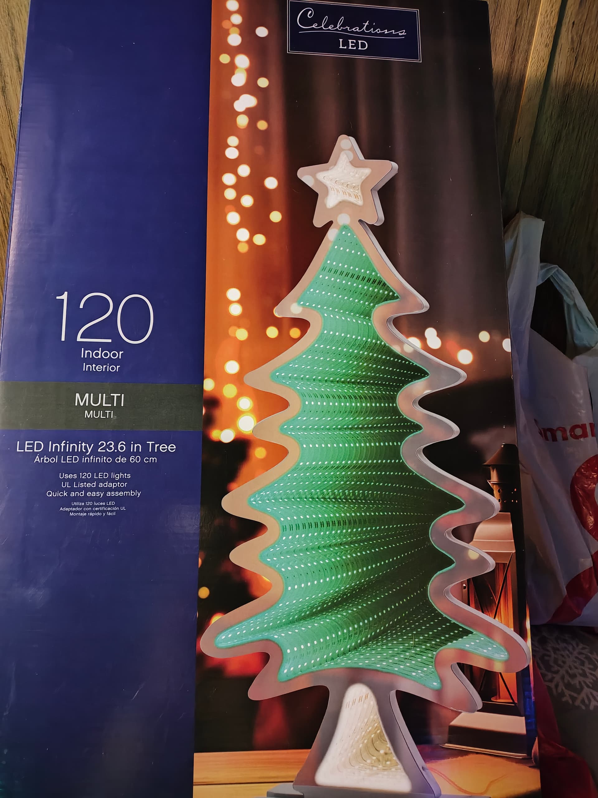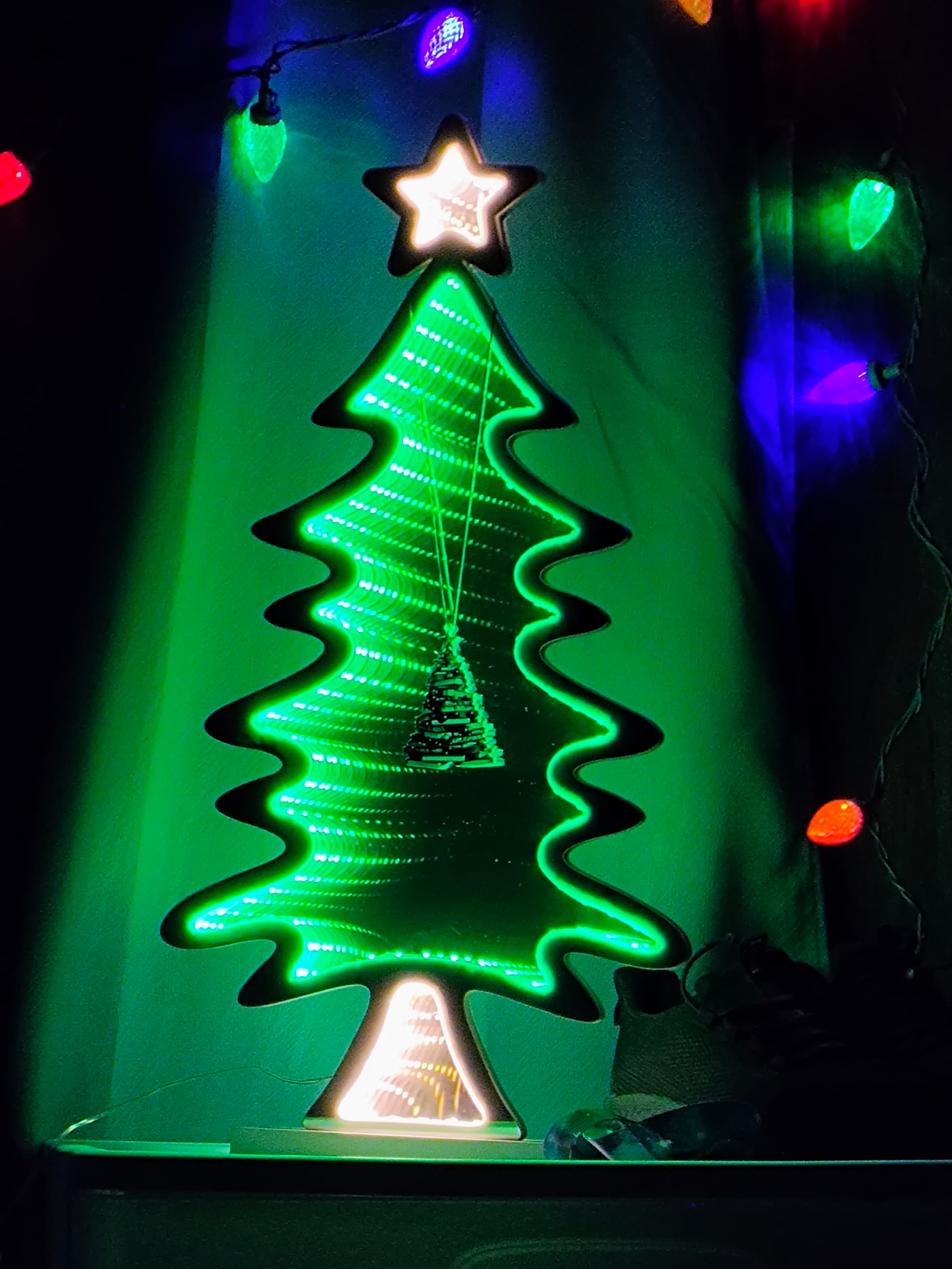 I stopped by the hardware store on the way home from work today. I picked up an LED multi color string of bulbs and an LED infinity tree. It’s very neat. A double sided mirror with lights in the frame that’s only about an inch thick. It would be perfect in a windowsill once I’m in a larger space. For now, it’s in my room. I’ve hung a single flat ornament from the star.