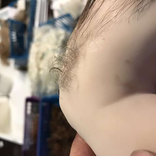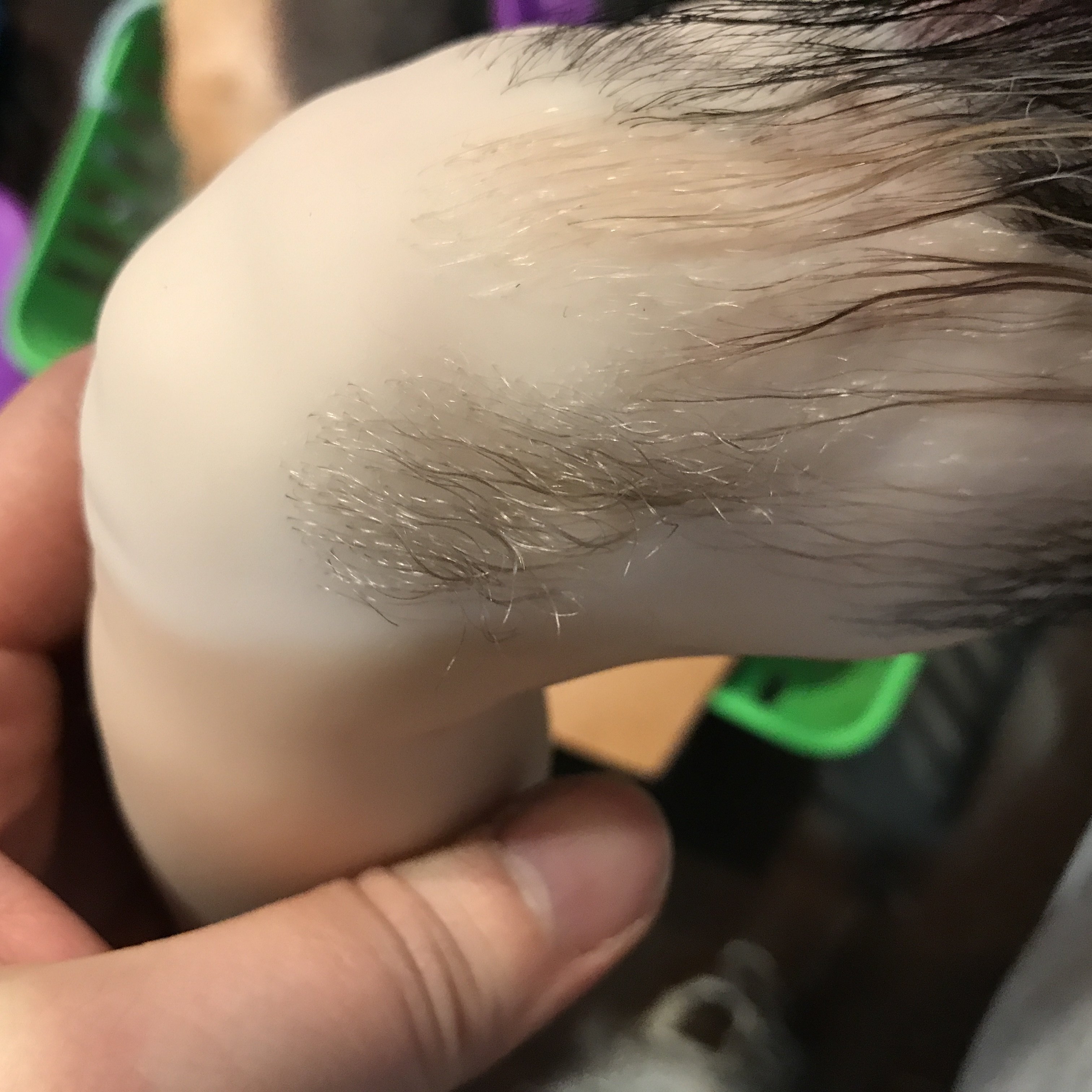 Lynn- do you have a test limb? Kid hair really is lovely once you get the hang of it. I made this little test patch for you last night so you can see. (Weird discarded grey hair! Haha) I purposefully rooted heavily by stabbing straight through a small bundle of hair with a 42g crown needle (3 barbs all at the tip) So you can see plugs a little bit, but it doesn’t look too bad. You’d have fewer plugs with your single barb needle, and I don’t think you’d need to isolate a teensy hair- but rather poke through a small bunch of hair. Just a thought. I understand the time commitment involved in rooting, so in the end you’ve gotta do what you’ll be happy with!