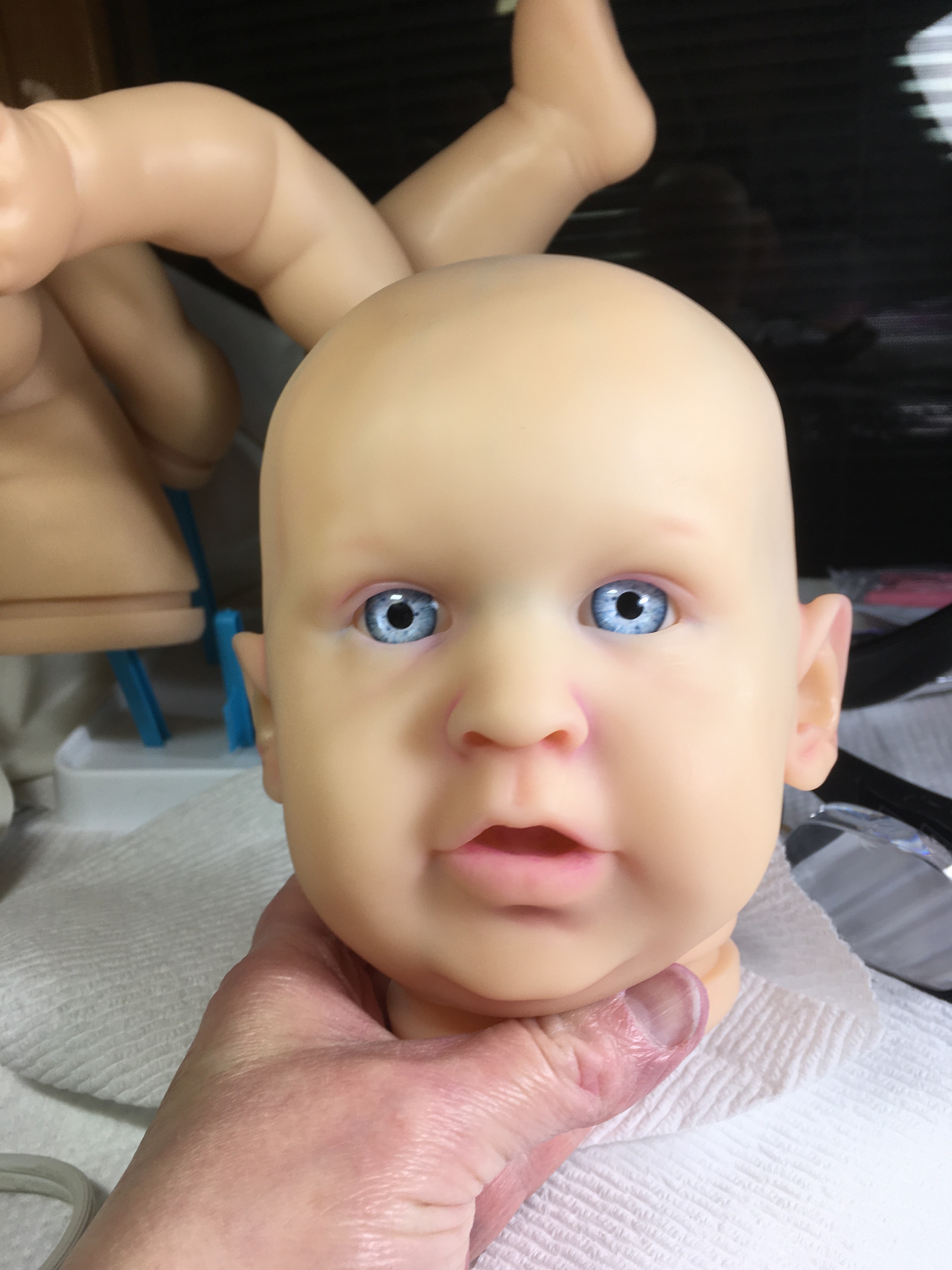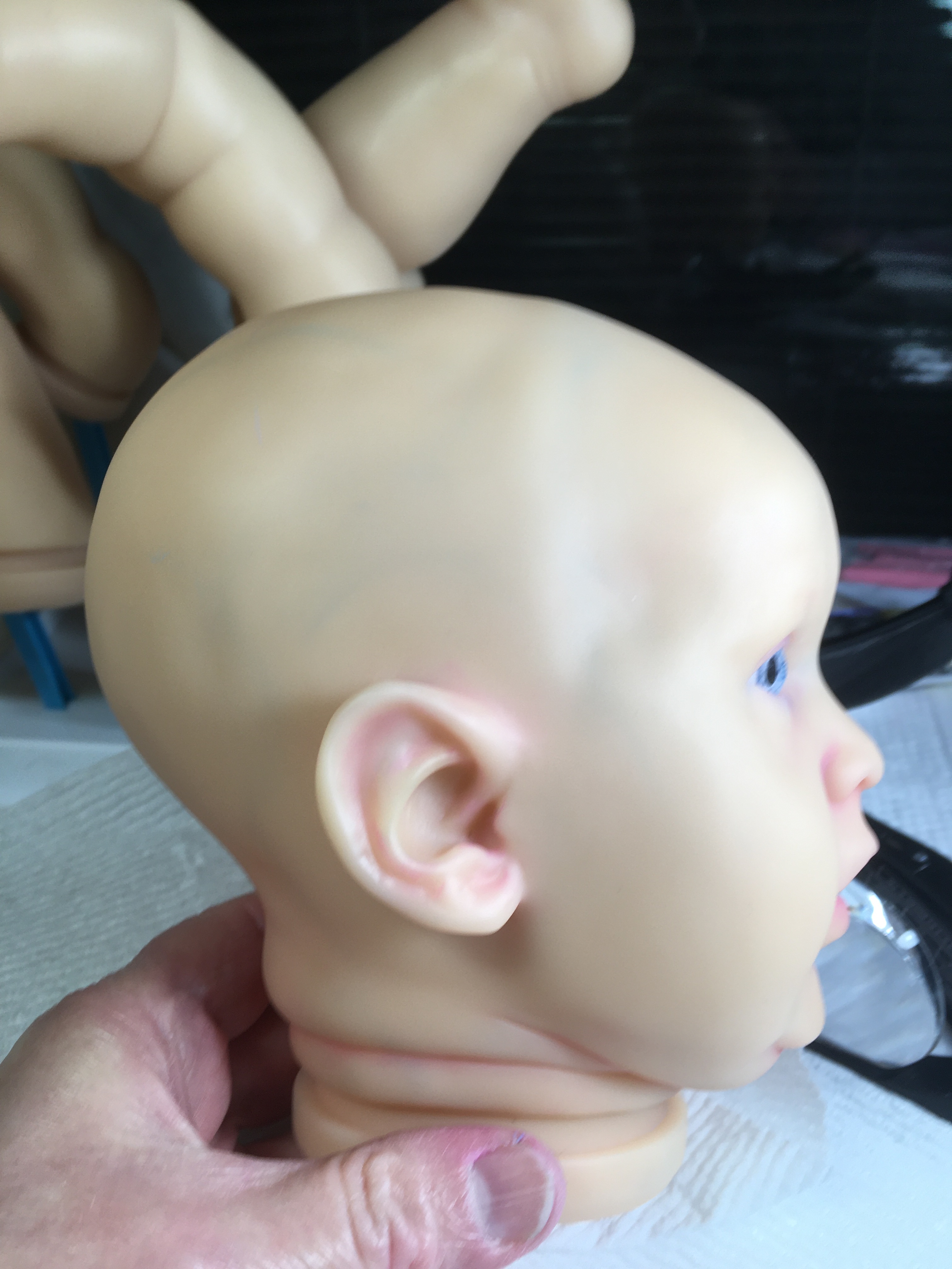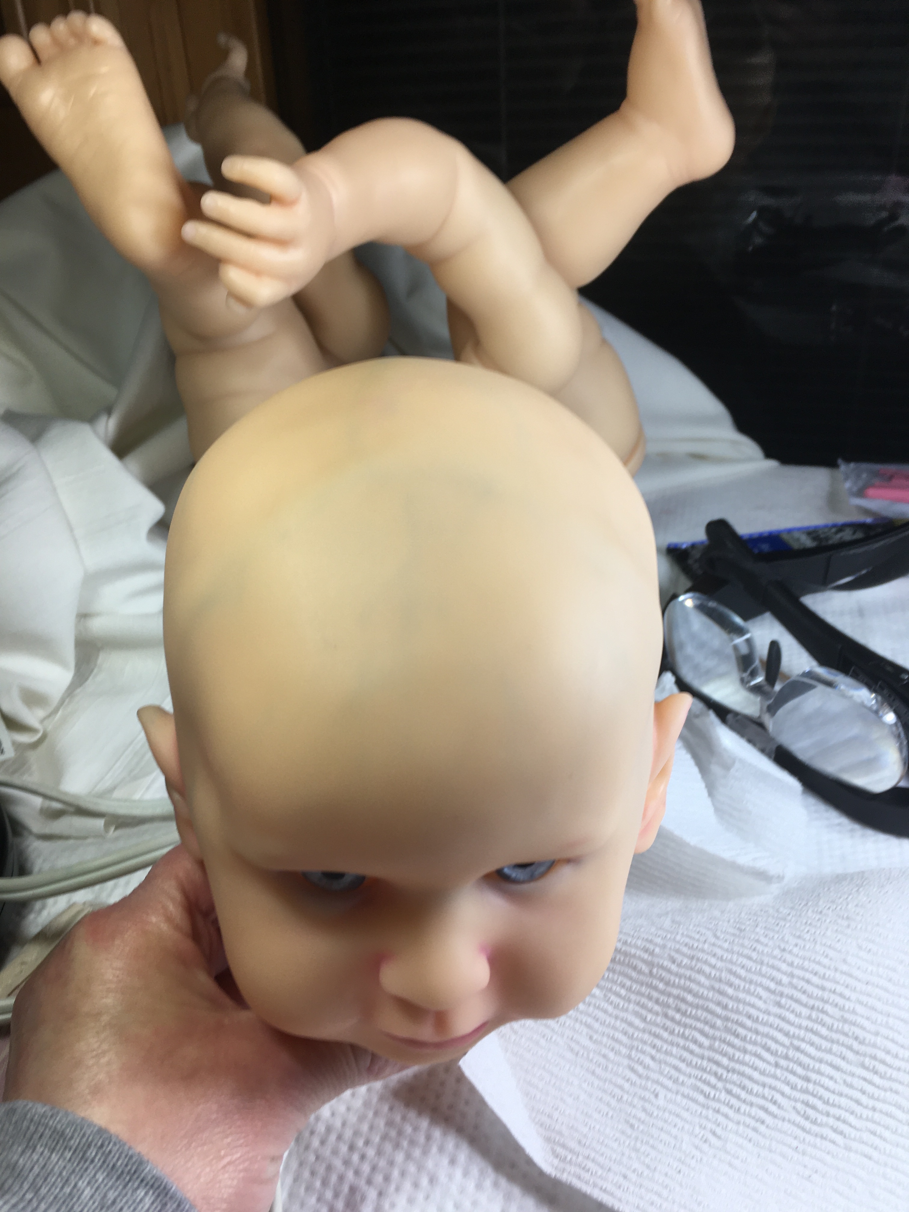 I would not tell anyone to do what I am doing. I was so frustrated I am trying something that may have been done. I don’t know. I am creating my own color powders with high pigment chalk. Here is some veining and shading with powders I created. I appreciate critiques. This doll is staying in my family. No mottling or wash layers yet. I may have to darken shades as I go. I am heavy handed with color. I put the eyes in to see how it looks at this point.