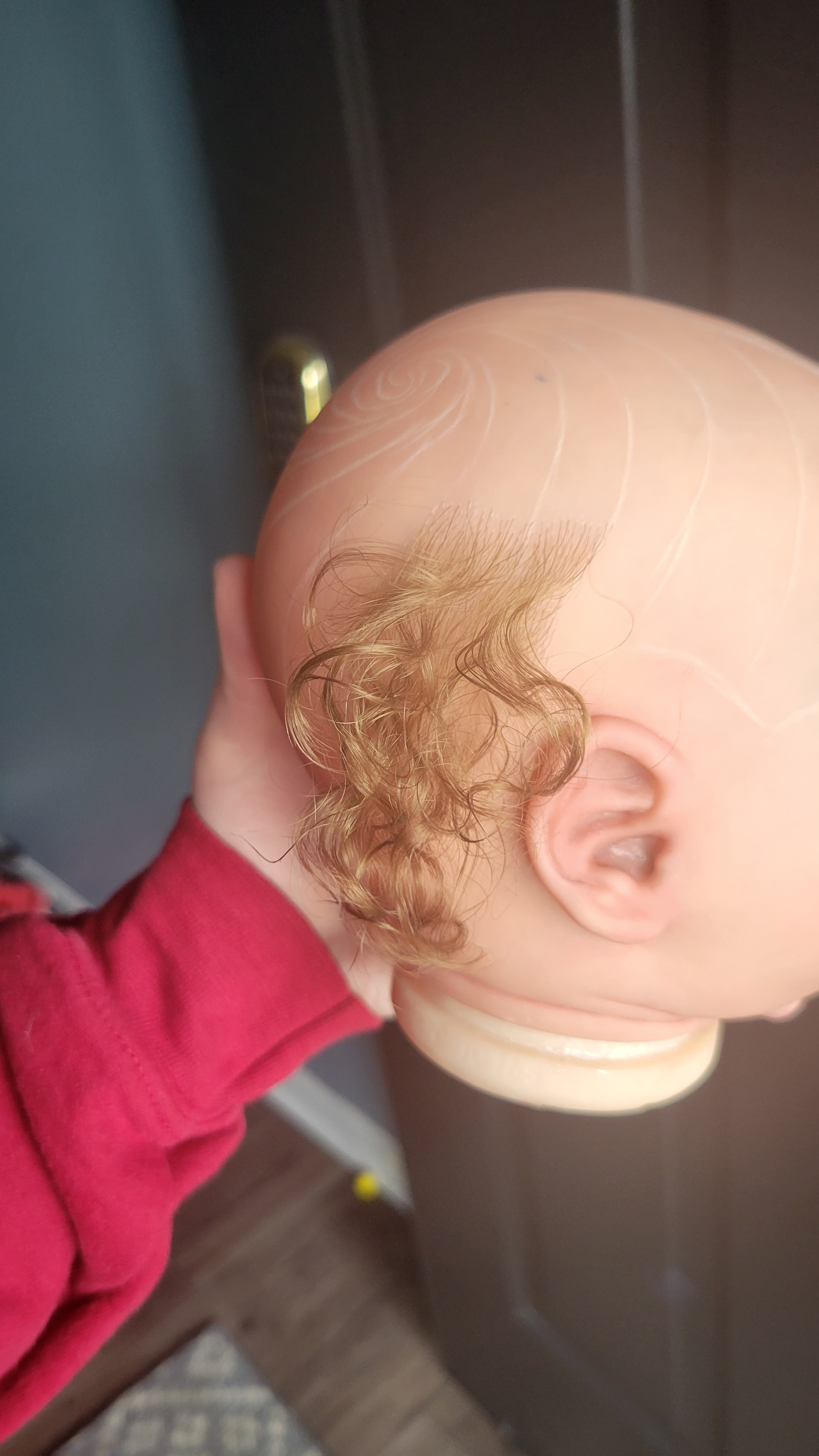 I started rooting Landon the other night! The moahair I’m using is a bit wavy but when I first started rooting it would straighten out when I got it wet…not at all what happened! Guess he wanted to be a curly boy