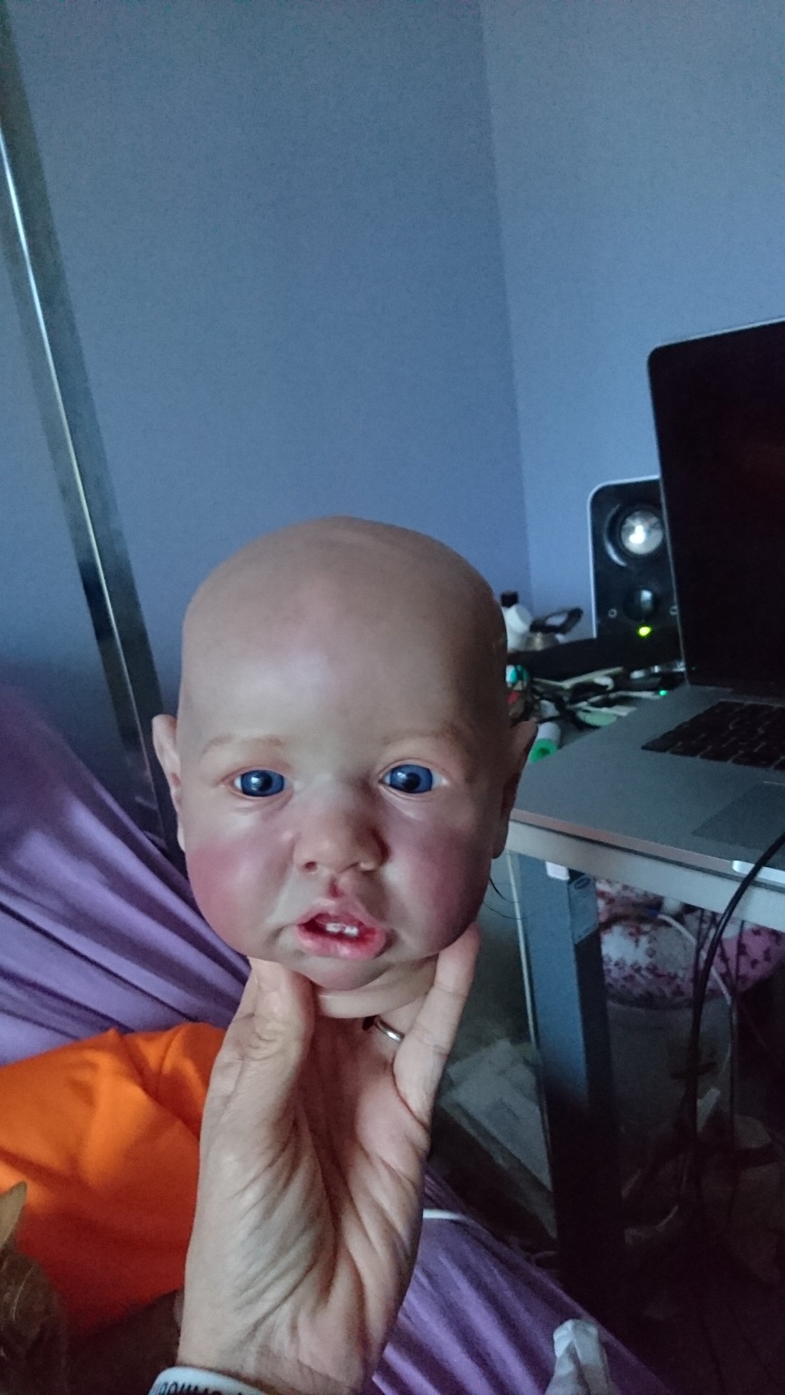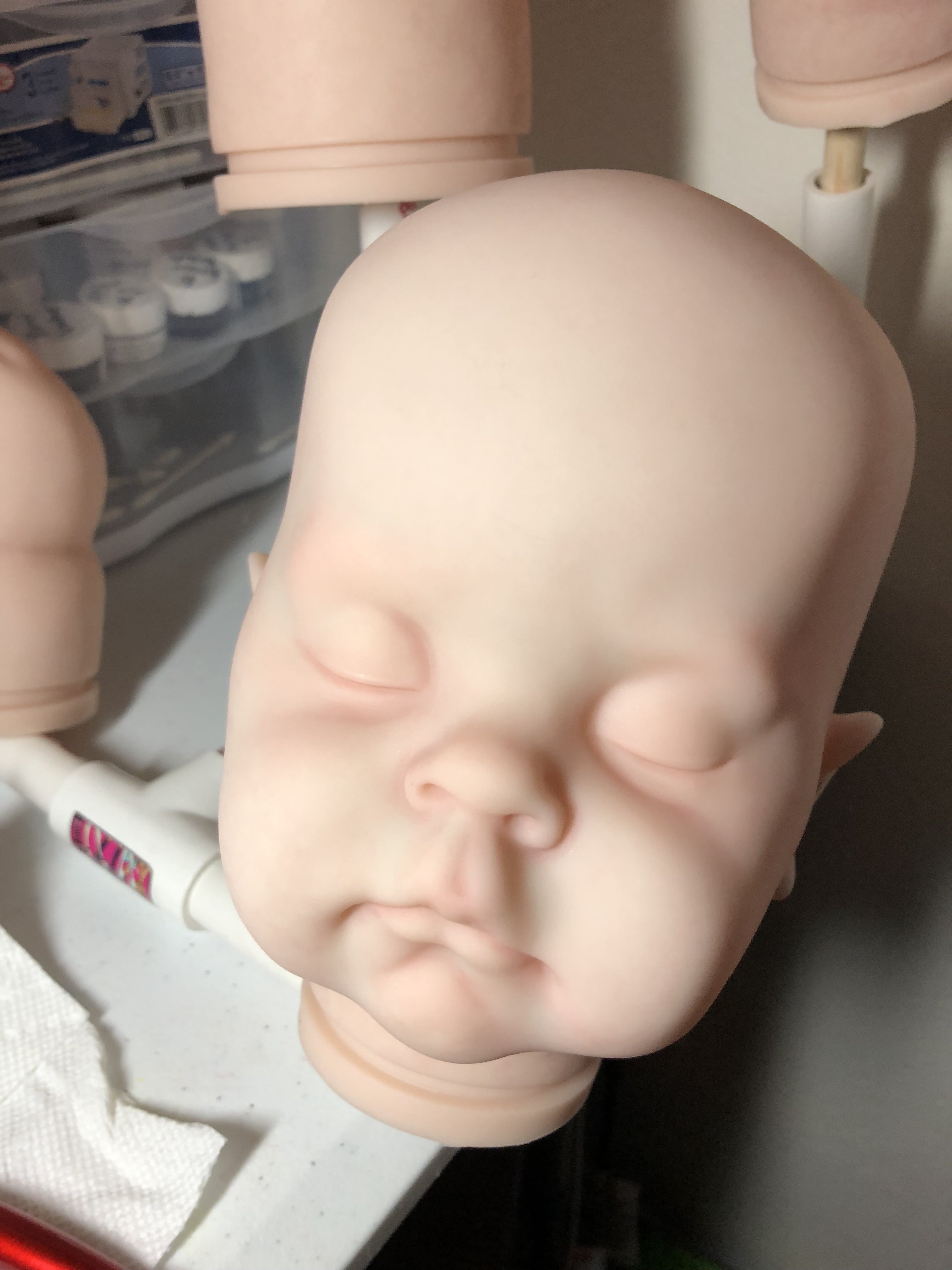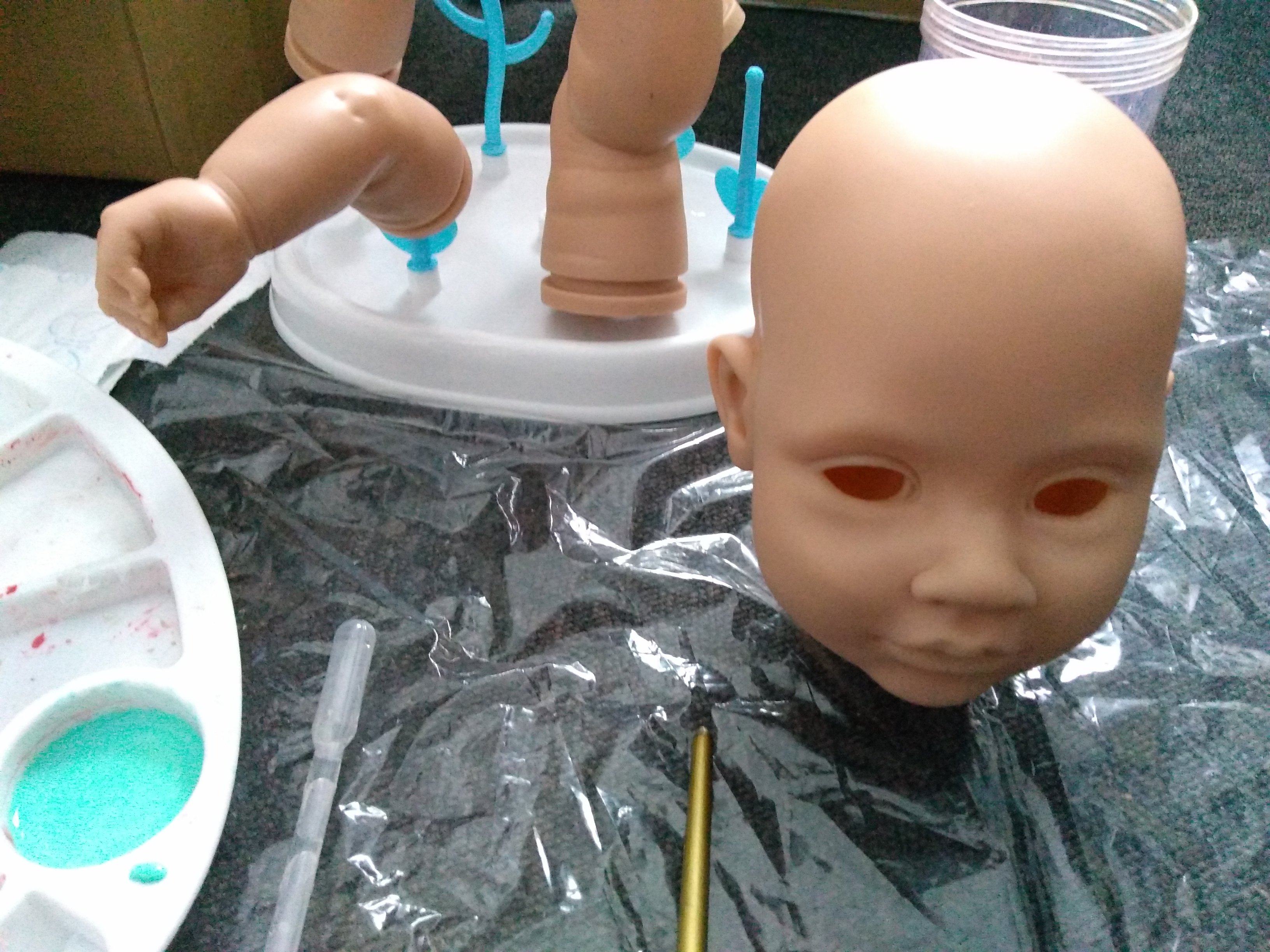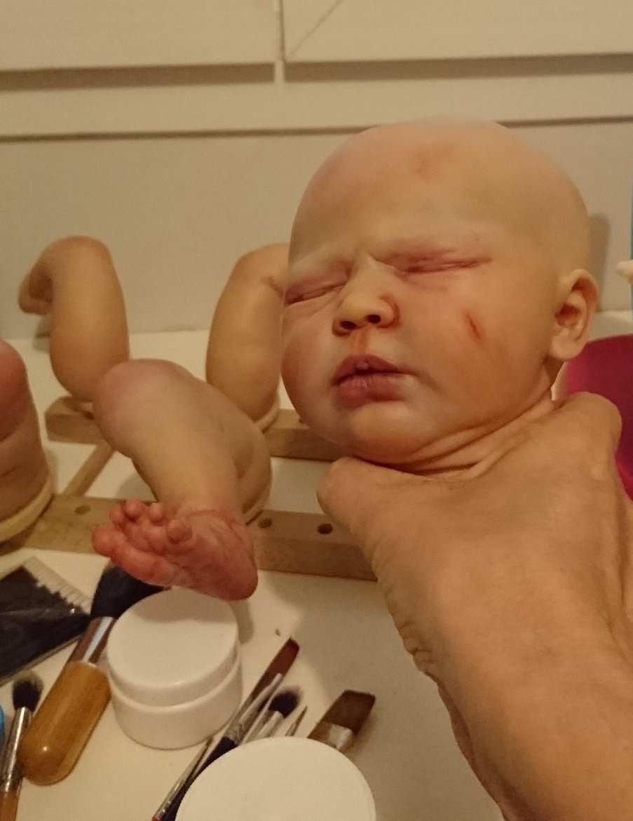 First of all…I apologise for the lighting, its terrible but I wanted to show what Ive been doing, and Ive been busy all day so thought to take pics in the evening. Two of them are finished aside from pacifier magnets and, of course, I need to put them together. Little Kaelin is going to have her hair applied “Glued down” because I don’t really care for the hair I used so Im just going to cut it shorter and then put the medium on. A couple of these babies I painted months ago and Ive been sprucing them up. My Saskia, Ashley, Summer Rain and Xander were partially finished so I used mainly Golden paints and Panpastels. I love my Panpastels btw. I have June ready for paint in the background. I took a closer pic of my Saskia, sorry about that as well, my cell phone takes bad pictures. I need to use my digital camera but we can’t find the charging cord LOL.