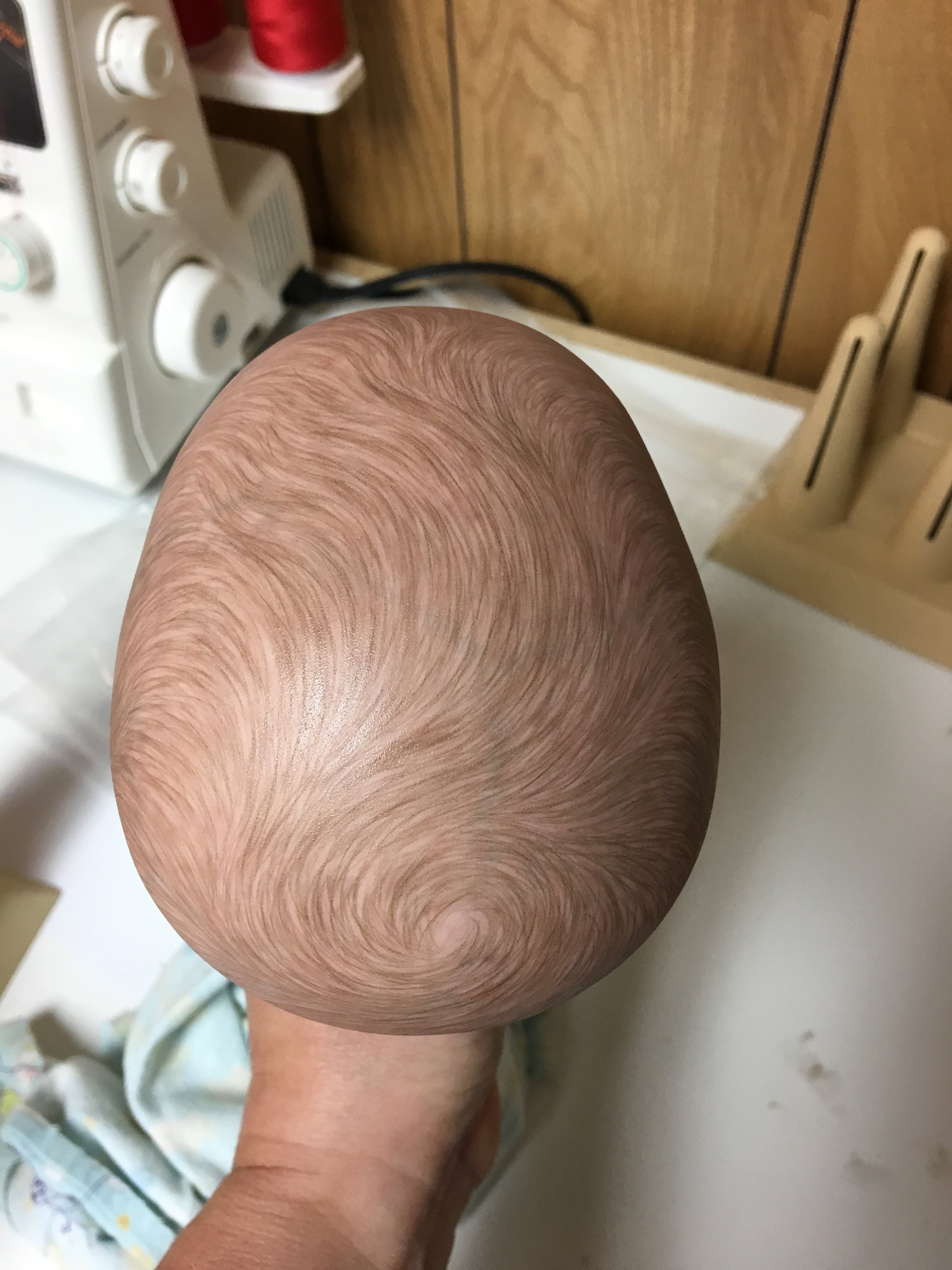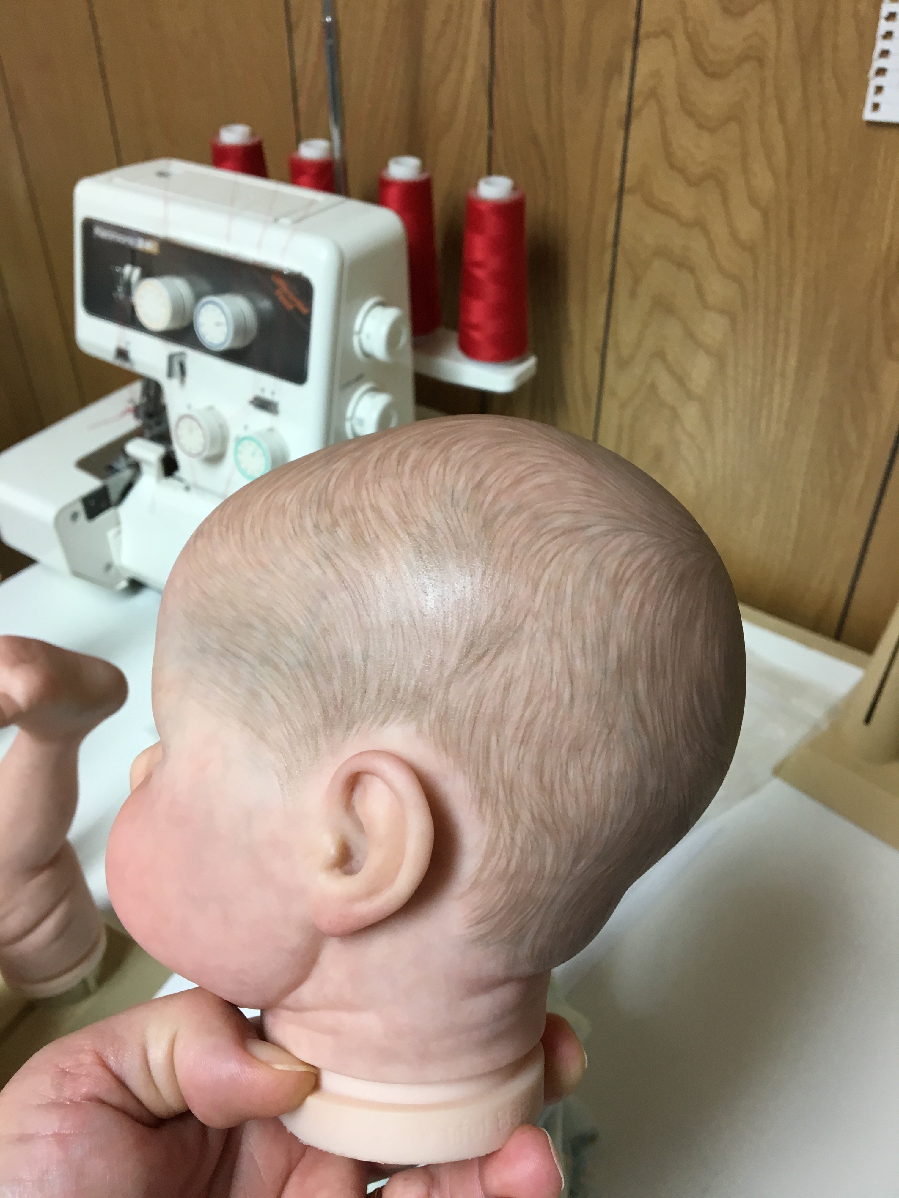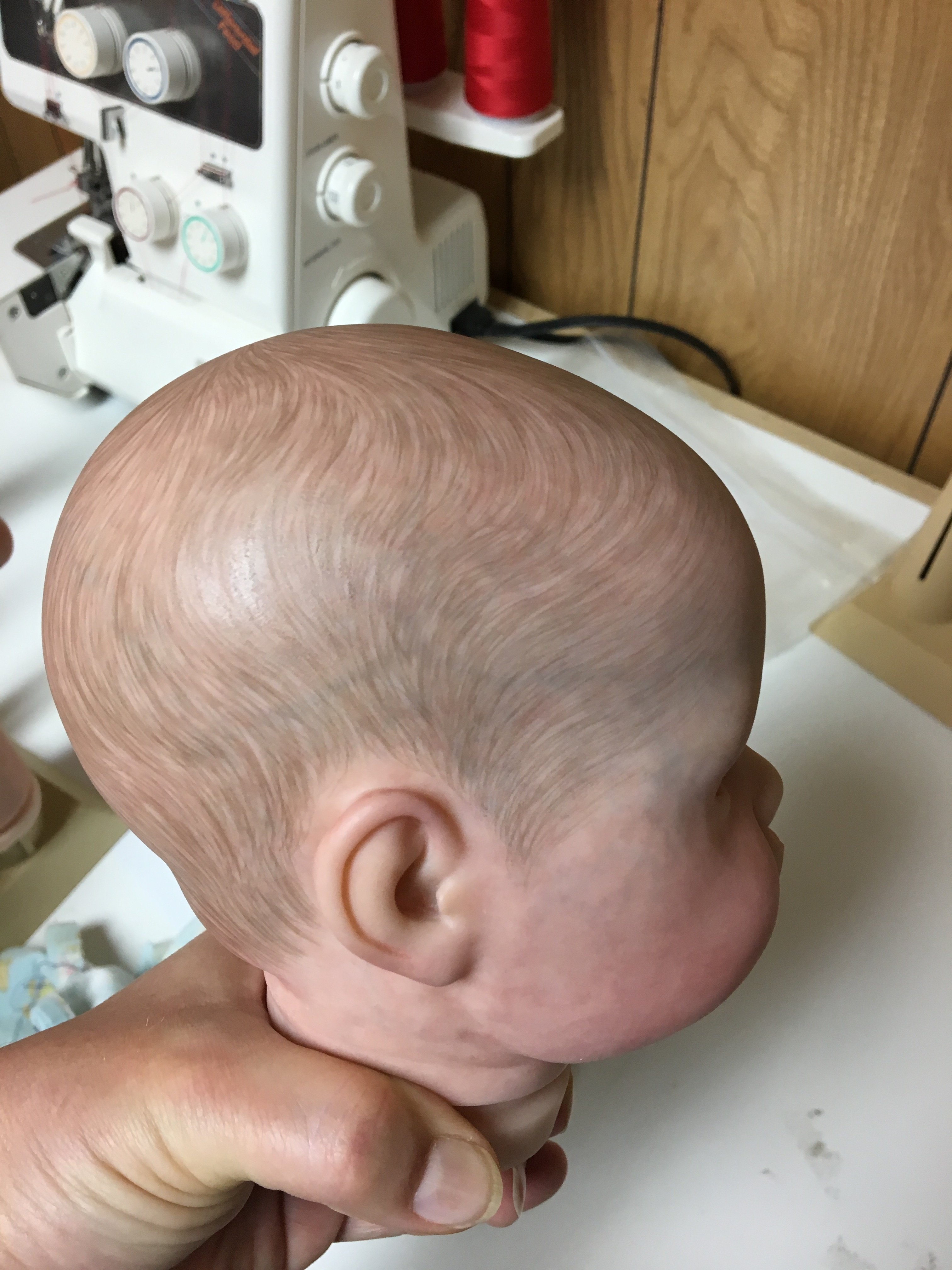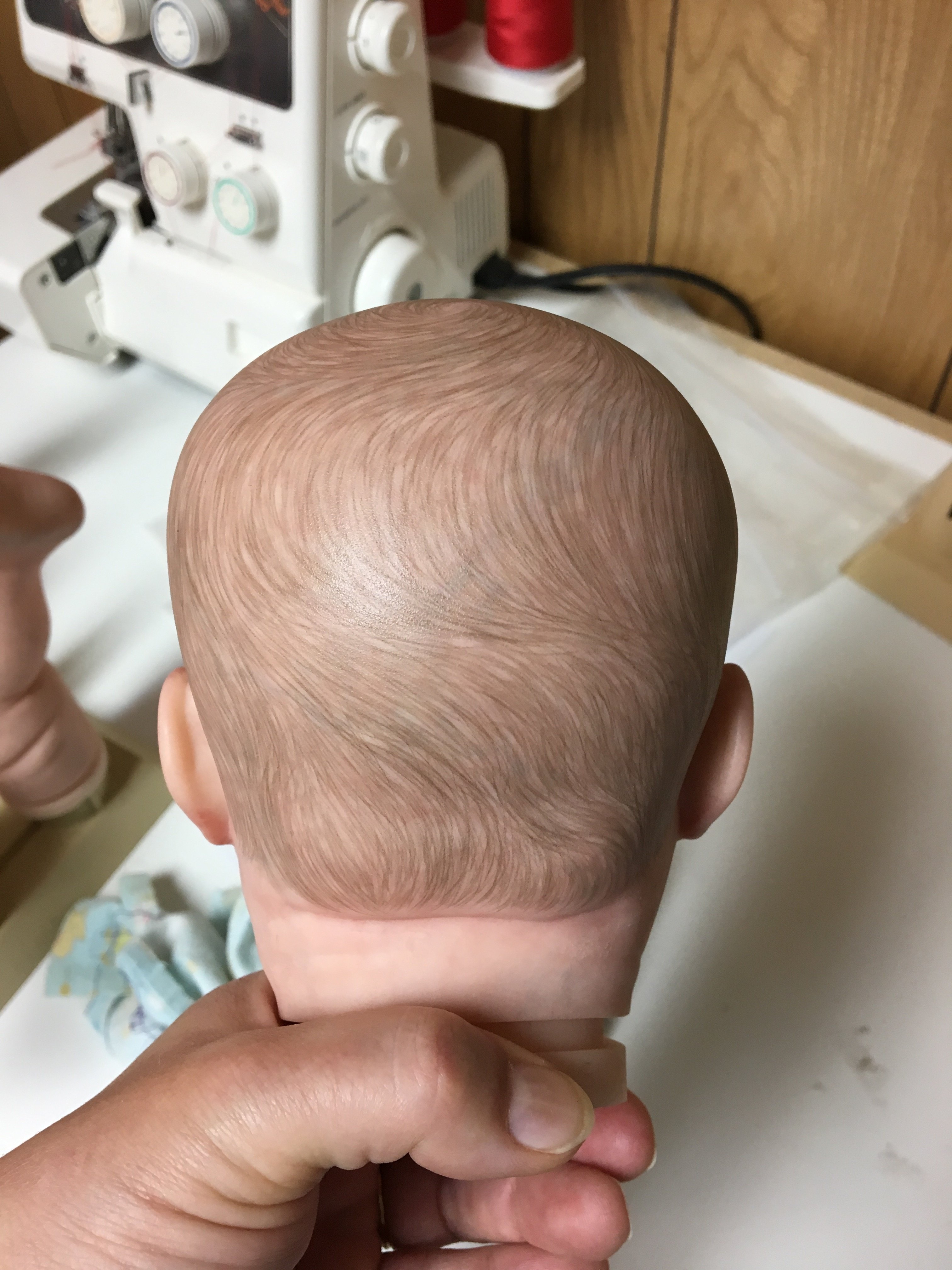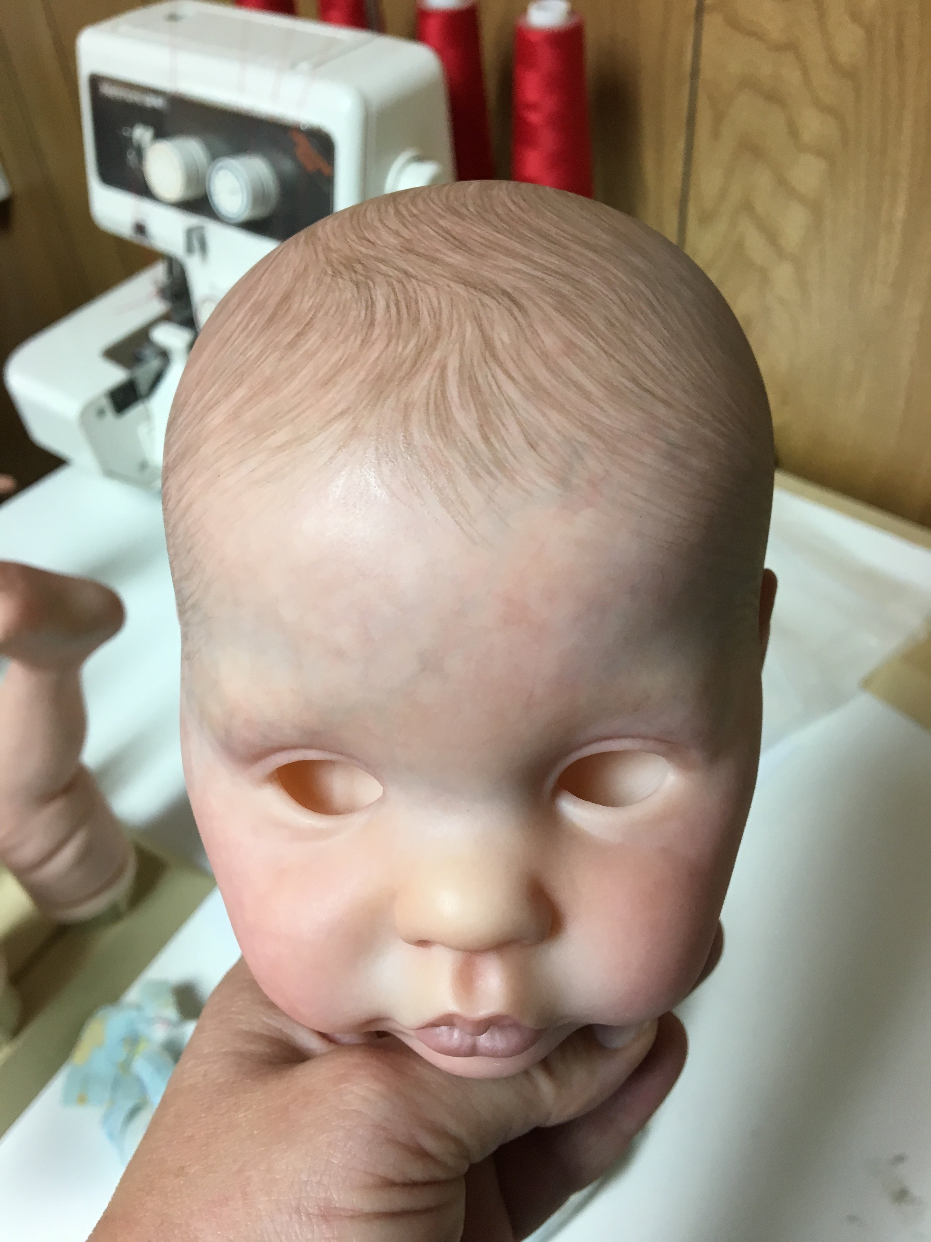 Working on Chanel’s hair, still have some highlighting to do, but it’s coming along. I don’t really care for her face, seems too doll like to me so I hope it can pass for a baby when she’s finished.