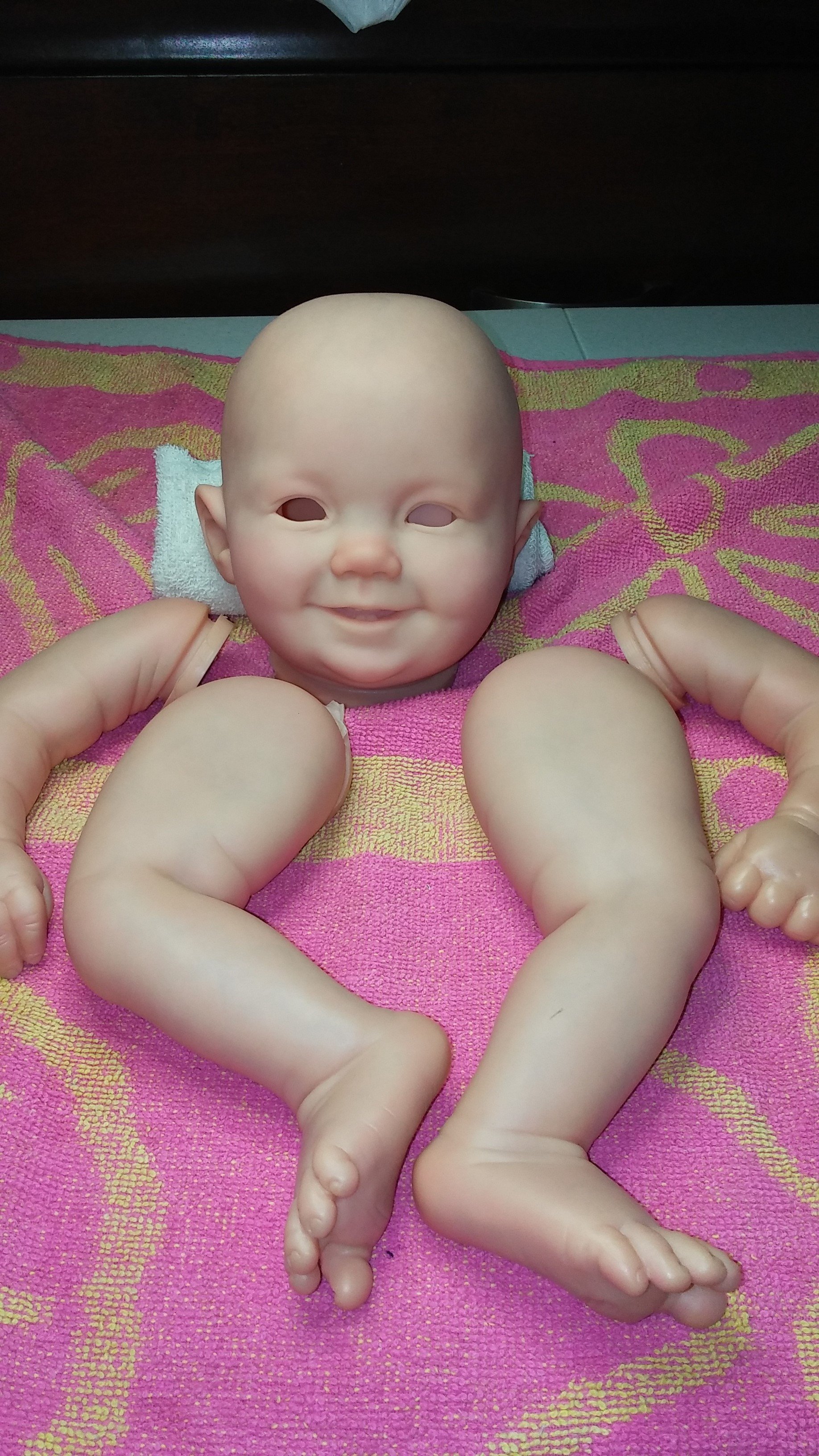 Can anyone tell me what this doll is missing or needs? I have no clue as to what to do next, I’m in the process of blushing does she look okay or is she still too pale? I used flesh 07 to help with the paleness and I did a yellow wash all to warm up the skin tone. I did three layers of translucent moddling but you can hardly see it. This is my first caucasian baby and I want to get it right. Any advice will be greatly appreciated.