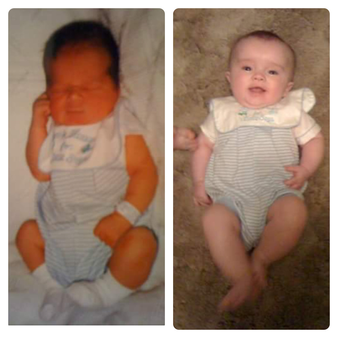 My others were 7.1, 8.4, and 8.3. I felt I got cheated on the whole newborn gig with giant Christian. But God made up for it with tiny Caedmon. Here’s Christian at one day old and Caedmon at 5 months old, both in the same size 3-6 month outfit that we brought Christian home from the hospital in.