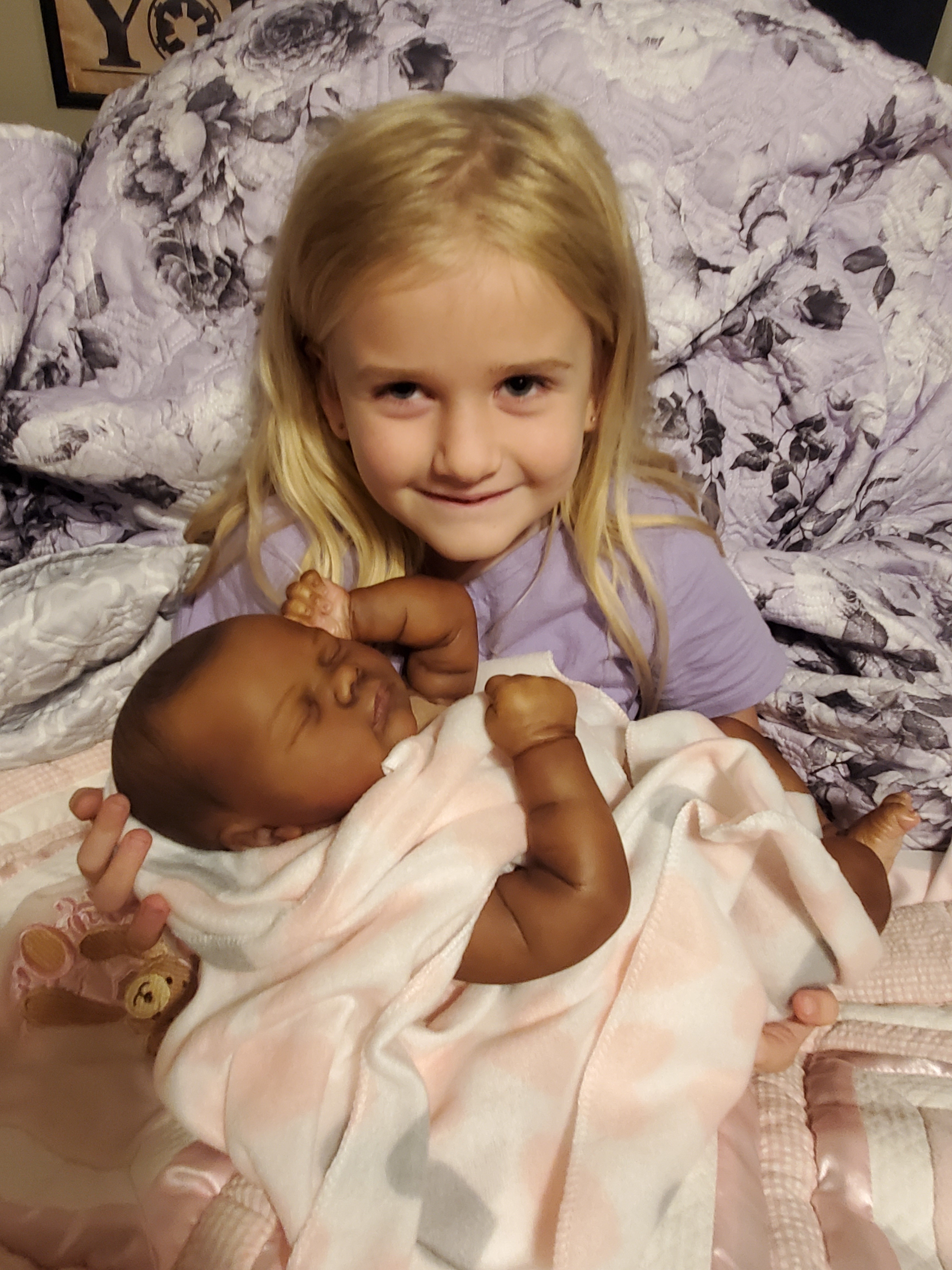 My Bella has to snuggle test every baby before I send them home. I finally finished Jades painted hair today and wanted to get a good pic of her skintone for her mommy before I seal her. Got a quick pic of my official baby snuggler in action too. Ignore the lump behind the quilt lol. Hubby didn’t want to be in the picture