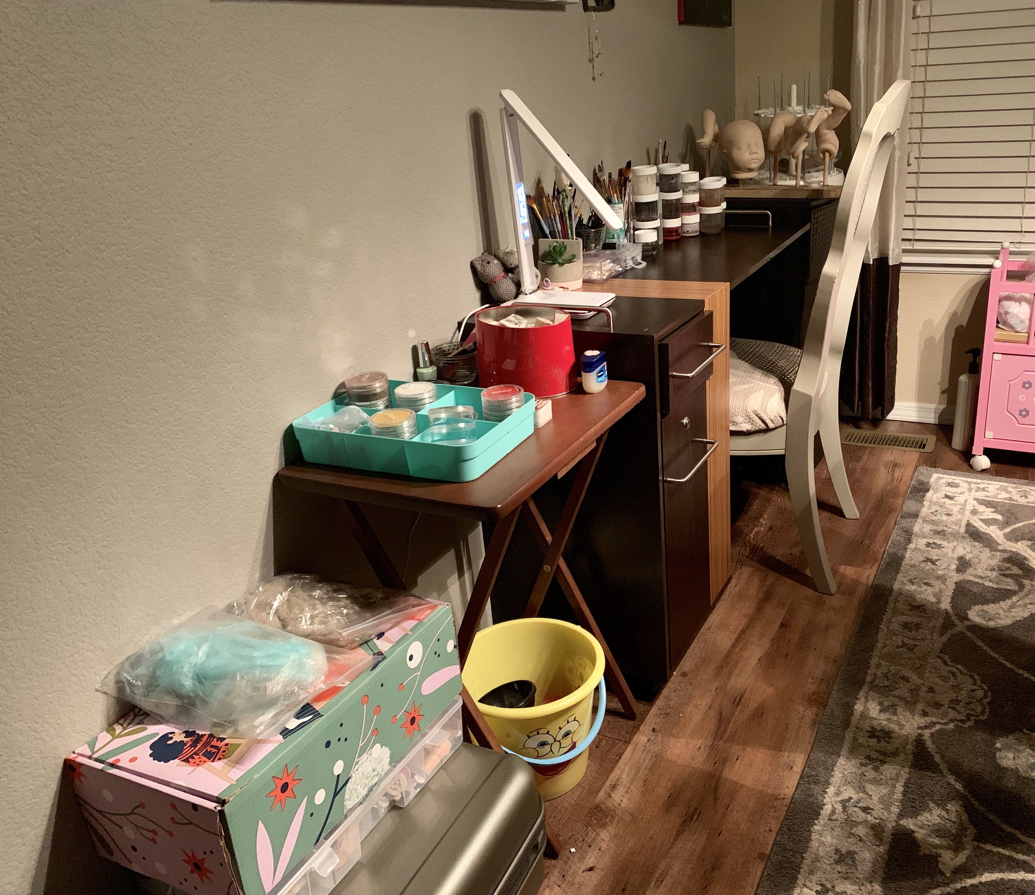 I’m loving all of these work stations! Here’s a pic of where I paint… I used to be a manicurist so I repurposed my manicuring table into a reborning table. I wish I had more space though. It’s getting crowded!