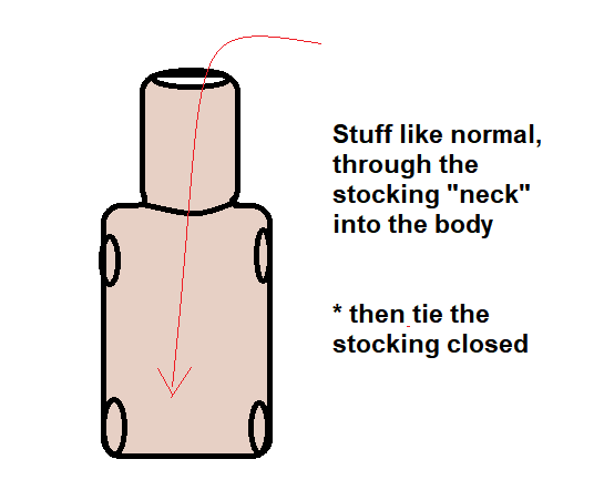 The body is intended to be stuffed like normal through the opening of the nylon. Make sure the nylon remains on the outside of the body while stuffing. The nylon is then tied to seal the stuffing inside. The nylon itself is not intended to be stuffed, but just to seal off the opening.