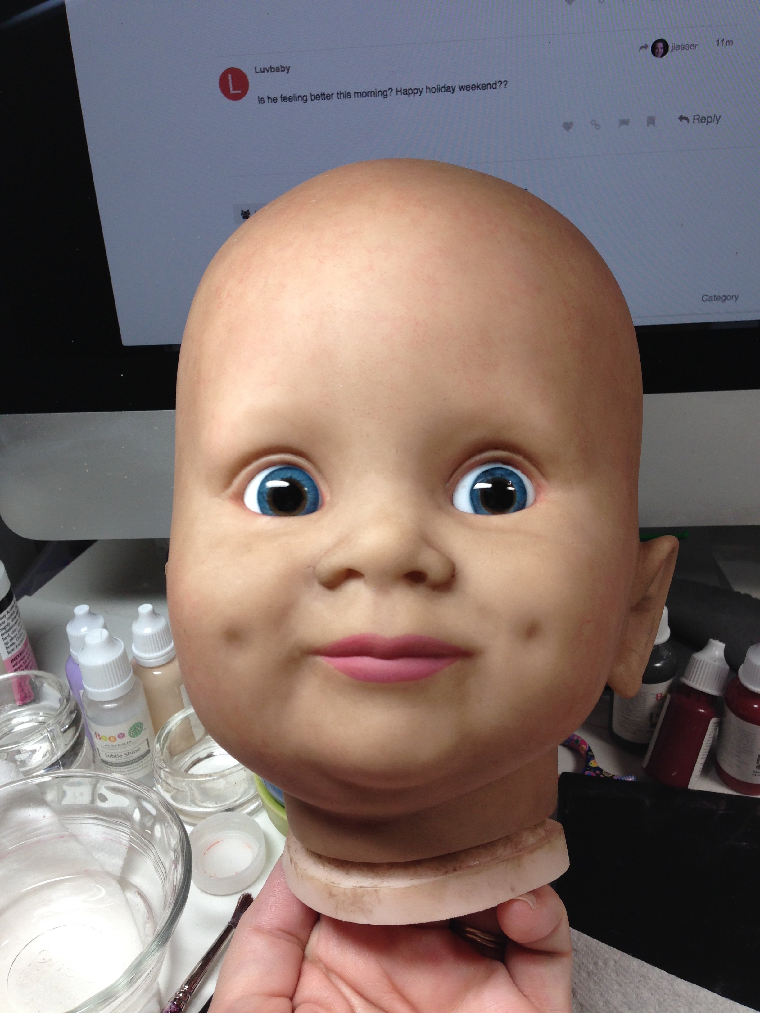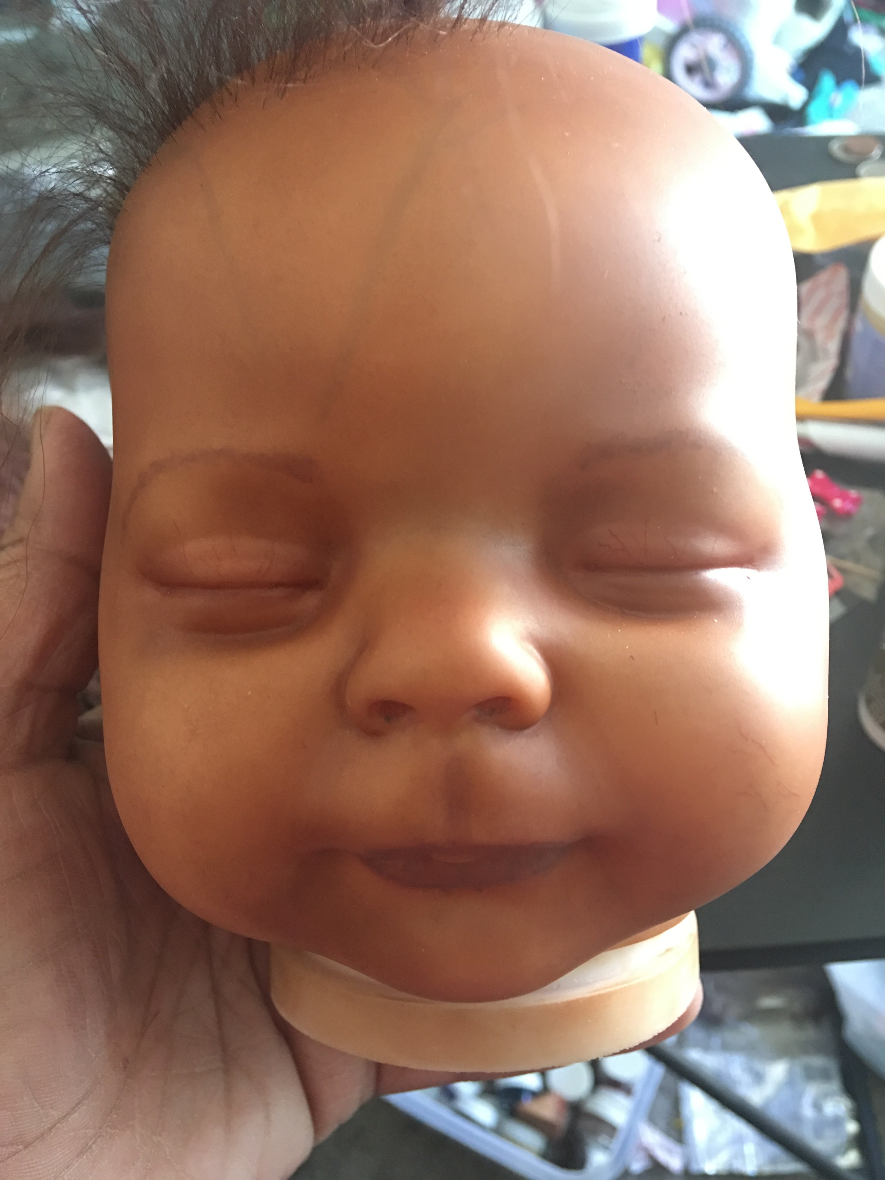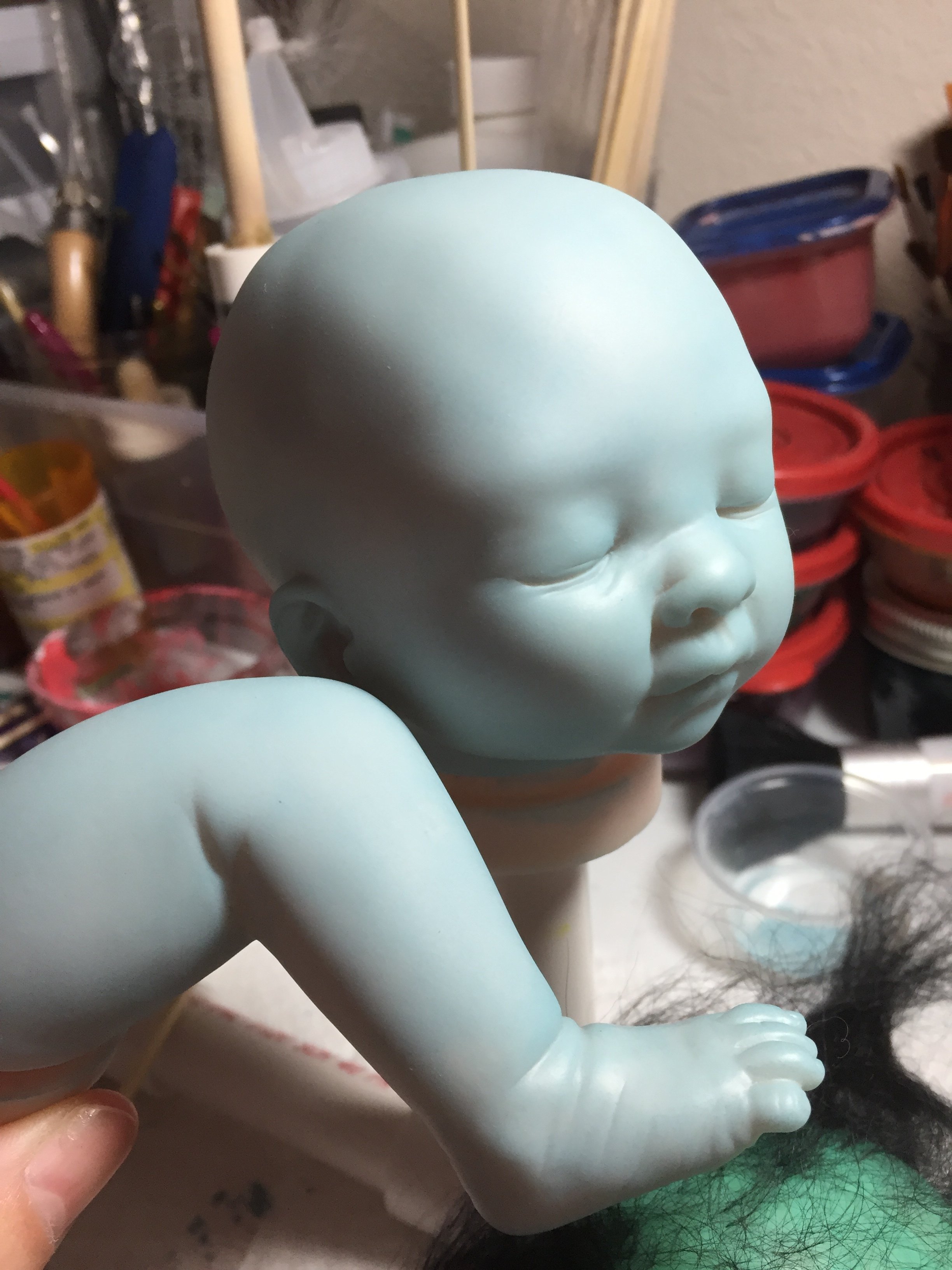 Hi, I’m Bette. Mostly I’m working on taking care of little Kinsay, but when he naps, I am working on a custom Juan. Her eyes haven’t been set, but I just can’t stand looking at the empty sockets so I put them in while I work. LOL