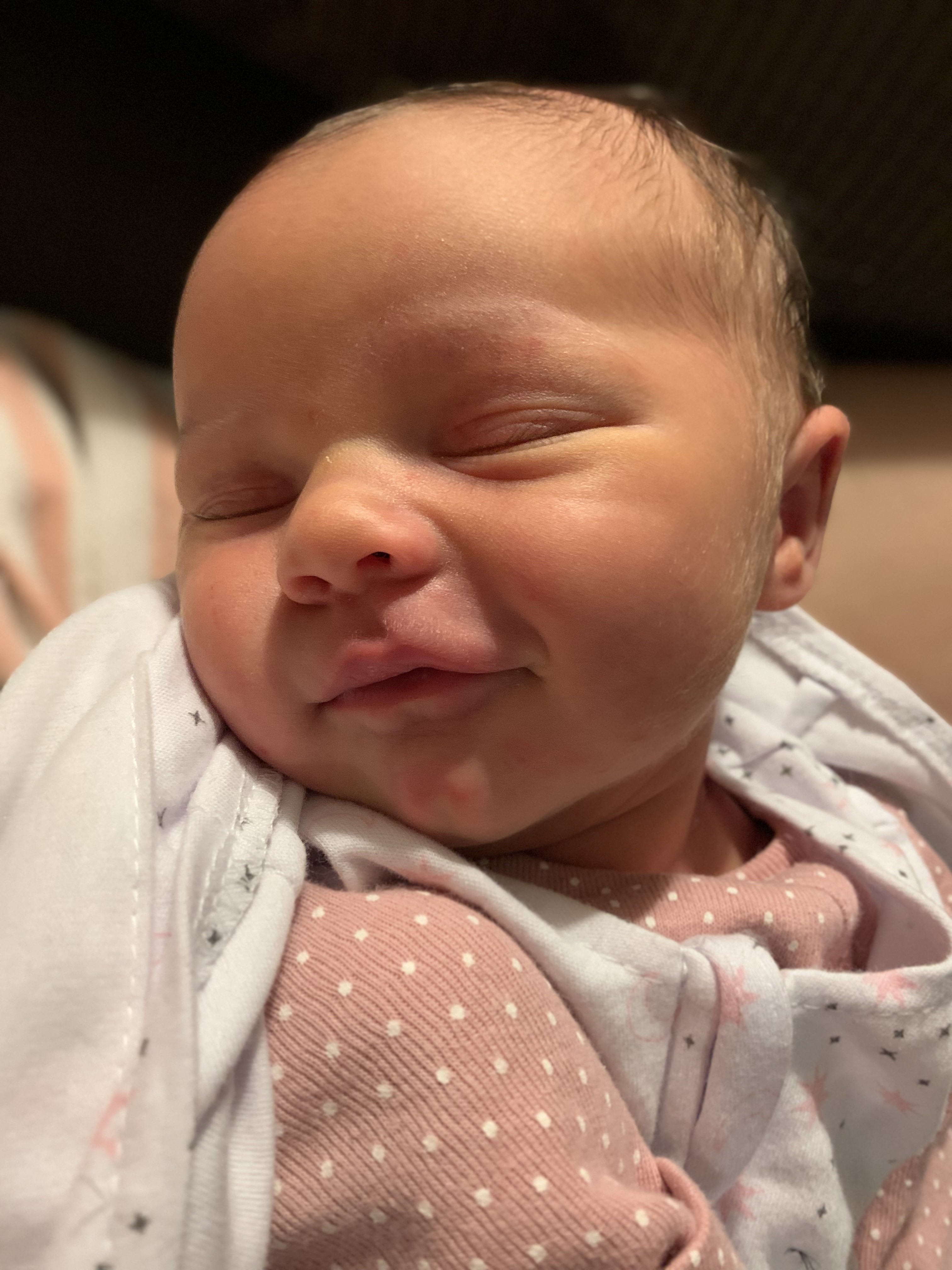 Congratulations! She’s beautiful and so alert.The happy baby dream smile is so cute! What do her big sisters think of her?